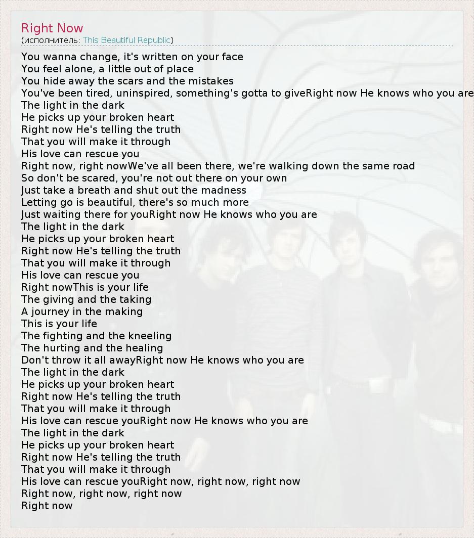 You wanna change, it's written on your face You feel alone, a little out of place You hide away the scars and the mistakes You've been tired, uninspired, something's gotta to giveRight now He knows who you are The light in the dark He picks up your broken heart Right now He's telling the truth That you will make it through His love can rescue you Right now, right nowWe've all been there, we're walking down the same road So don't be scared, you're not out there on your own Just take a breath and shut out the madness Letting go is beautiful, there's so much more Just waiting there for youRight now He knows who you are The light in the dark He picks up your broken heart Right now He's telling the truth That you will make it through His love can rescue you Right nowThis is your life The giving and the taking A journey in the making This is your life The fighting and the kneeling The hurting and the healing Don't throw it all awayRight now He knows who you are The light in the dark He picks up your broken heart Right now He's telling the truth That you will make it through His love can rescue youRight now He knows who you are The light in the dark He picks up your broken heart Right now He's telling the truth That you will make it through His love can rescue youRight now, right now, right now Right now, right now, right now Right now