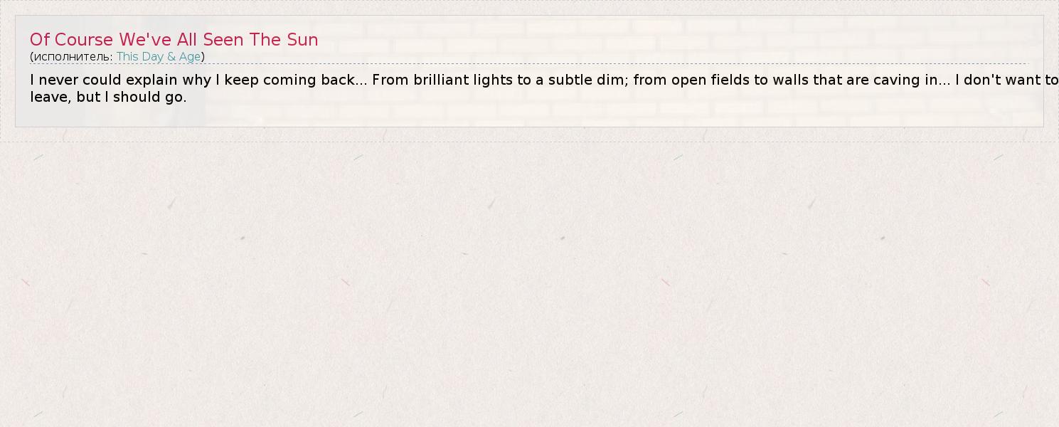 ГлавнаяИсполнителиThis Day & AgeOf Course We've All Seen The Sun