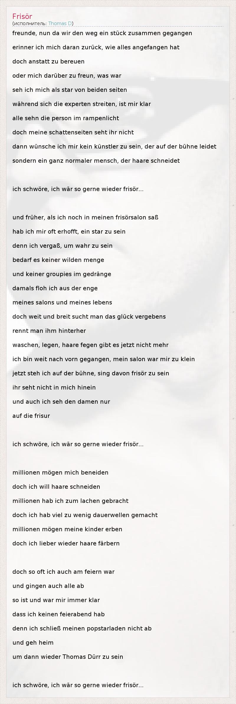 freunde, nun da wir den weg ein stück zusammen gegangen erinner ich mich daran zurück, wie alles angefangen hat doch anstatt zu bereuen oder mich darüber zu freun, was war seh ich mich als star von beiden seiten während sich die experten streiten, ist mir klar alle sehn die person im rampenlicht doch meine schattenseiten seht ihr nicht dann wünsche ich mir kein künstler zu sein, der auf der bühne leidet sondern ein ganz normaler mensch, der haare schneidet ich schwöre, ich wär so gerne wieder frisör... und früher, als ich noch in meinen frisörsalon saß hab ich mir oft erhofft, ein star zu sein denn ich vergaß, um wahr zu sein bedarf es keiner wilden menge und keiner groupies im gedränge damals floh ich aus der enge meines salons und meines lebens doch weit und breit sucht man das glück vergebens rennt man ihm hinterher waschen, legen, haare fegen gibt es jetzt nicht mehr ich bin weit nach vorn gegangen, mein salon war mir zu klein jetzt steh ich auf der bühne, sing davon frisör zu sein ihr seht nicht in mich hinein und auch ich seh den damen nur auf die frisur ich schwöre, ich wär so gerne wieder frisör... millionen mögen mich beneiden doch ich will haare schneiden millionen hab ich zum lachen gebracht doch ich hab viel zu wenig dauerwellen gemacht millionen mögen meine kinder erben doch ich lieber wieder haare färbern doch so oft ich auch am feiern war und gingen auch alle ab so ist und war mir immer klar dass ich keinen feierabend hab denn ich schließ meinen popstarladen nicht ab und geh heim um dann wieder Thomas Dürr zu sein ich schwöre, ich wär so gerne wieder frisör...