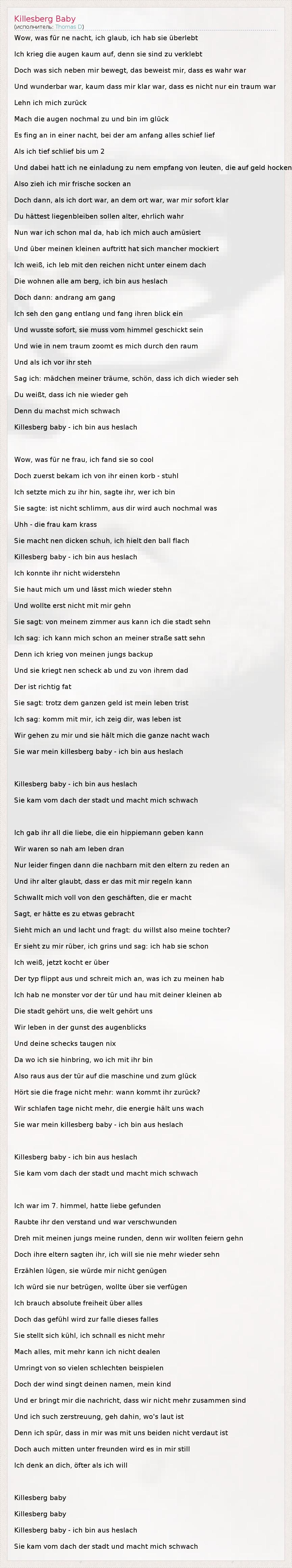 Wow, was für ne nacht, ich glaub, ich hab sie überlebt Ich krieg die augen kaum auf, denn sie sind zu verklebt Doch was sich neben mir bewegt, das beweist mir, dass es wahr war Und wunderbar war, kaum dass mir klar war, dass es nicht nur ein traum war Lehn ich mich zurück Mach die augen nochmal zu und bin im glück Es fing an in einer nacht, bei der am anfang alles schief lief Als ich tief schlief bis um 2 Und dabei hatt ich ne einladung zu nem empfang von leuten, die auf geld hocken Also zieh ich mir frische socken an Doch dann, als ich dort war, an dem ort war, war mir sofort klar Du hättest liegenbleiben sollen alter, ehrlich wahr Nun war ich schon mal da, hab ich mich auch amüsiert Und über meinen kleinen auftritt hat sich mancher mockiert Ich weiß, ich leb mit den reichen nicht unter einem dach Die wohnen alle am berg, ich bin aus heslach Doch dann: andrang am gang Ich seh den gang entlang und fang ihren blick ein Und wusste sofort, sie muss vom himmel geschickt sein Und wie in nem traum zoomt es mich durch den raum Und als ich vor ihr steh Sag ich: mädchen meiner träume, schön, dass ich dich wieder seh Du weißt, dass ich nie wieder geh Denn du machst mich schwach Killesberg baby - ich bin aus heslach Wow, was für ne frau, ich fand sie so cool Doch zuerst bekam ich von ihr einen korb - stuhl Ich setzte mich zu ihr hin, sagte ihr, wer ich bin Sie sagte: ist nicht schlimm, aus dir wird auch nochmal was Uhh - die frau kam krass Sie macht nen dicken schuh, ich hielt den ball flach Killesberg baby - ich bin aus heslach Ich konnte ihr nicht widerstehn Sie haut mich um und lässt mich wieder stehn Und wollte erst nicht mit mir gehn Sie sagt: von meinem zimmer aus kann ich die stadt sehn Ich sag: ich kann mich schon an meiner straße satt sehn Denn ich krieg von meinen jungs backup Und sie kriegt nen scheck ab und zu von ihrem dad Der ist richtig fat Sie sagt: trotz dem ganzen geld ist mein leben trist Ich sag: komm mit mir, ich zeig dir, was leben ist Wir gehen zu mir und sie hält mich die ganze nacht wach Sie war mein killesberg baby - ich bin aus heslach Killesberg baby - ich bin aus heslach Sie kam vom dach der stadt und macht mich schwach Ich gab ihr all die liebe, die ein hippiemann geben kann Wir waren so nah am leben dran Nur leider fingen dann die nachbarn mit den eltern zu reden an Und ihr alter glaubt, dass er das mit mir regeln kann Schwallt mich voll von den geschäften, die er macht Sagt, er hätte es zu etwas gebracht Sieht mich an und lacht und fragt: du willst also meine tochter? Er sieht zu mir rüber, ich grins und sag: ich hab sie schon Ich weiß, jetzt kocht er über Der typ flippt aus und schreit mich an, was ich zu meinen hab Ich hab ne monster vor der tür und hau mit deiner kleinen ab Die stadt gehört uns, die welt gehört uns Wir leben in der gunst des augenblicks Und deine schecks taugen nix Da wo ich sie hinbring, wo ich mit ihr bin Also raus aus der tür auf die maschine und zum glück Hört sie die frage nicht mehr: wann kommt ihr zurück? Wir schlafen tage nicht mehr, die energie hält uns wach Sie war mein killesberg baby - ich bin aus heslach Killesberg baby - ich bin aus heslach Sie kam vom dach der stadt und macht mich schwach Ich war im 7. himmel, hatte liebe gefunden Raubte ihr den verstand und war verschwunden Dreh mit meinen jungs meine runden, denn wir wollten feiern gehn Doch ihre eltern sagten ihr, ich will sie nie mehr wieder sehn Erzählen lügen, sie würde mir nicht genügen Ich würd sie nur betrügen, wollte über sie verfügen Ich brauch absolute freiheit über alles Doch das gefühl wird zur falle dieses falles Sie stellt sich kühl, ich schnall es nicht mehr Mach alles, mit mehr kann ich nicht dealen Umringt von so vielen schlechten beispielen Doch der wind singt deinen namen, mein kind Und er bringt mir die nachricht, dass wir nicht mehr zusammen sind Und ich such zerstreuung, geh dahin, wo's laut ist Denn ich spür, dass in mir was mit uns beiden nicht verdaut ist Doch auch mitten unter freunden wird es in mir still Ich denk an dich, öfter als ich will Killesberg baby Killesberg baby Killesberg baby - ich bin aus heslach Sie kam vom dach der stadt und macht mich schwach