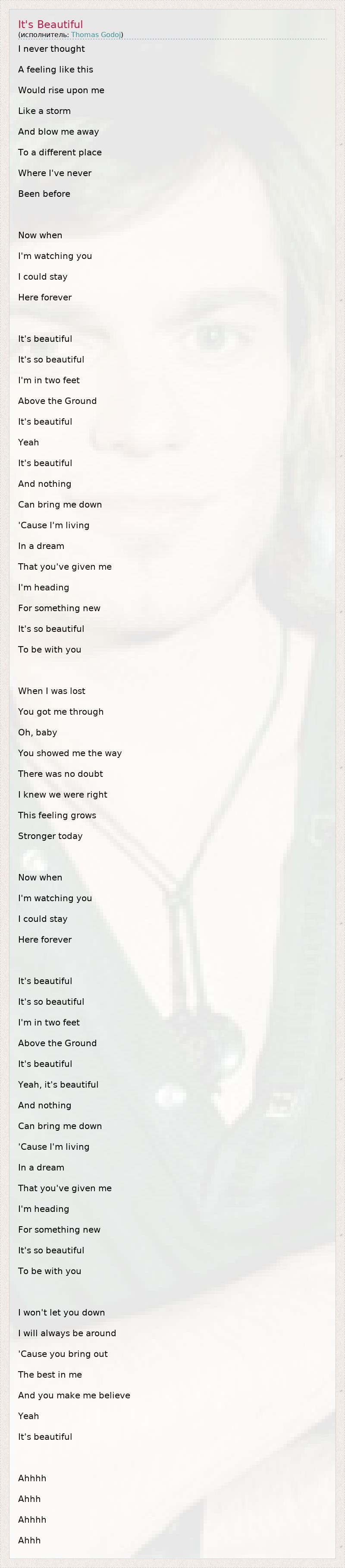 I never thought A feeling like this Would rise upon me Like a storm And blow me away To a different place Where I've never Been before Now when I'm watching you I could stay Here forever It's beautiful It's so beautiful I'm in two feet Above the Ground It's beautiful Yeah It's beautiful And nothing Can bring me down 'Cause I'm living In a dream That you've given me I'm heading For something new It's so beautiful To be with you When I was lost You got me through Oh, baby You showed me the way There was no doubt I knew we were right This feeling grows Stronger today Now when I'm watching you I could stay Here forever It's beautiful It's so beautiful I'm in two feet Above the Ground It's beautiful Yeah, it's beautiful And nothing Can bring me down 'Cause I'm living In a dream That you've given me I'm heading For something new It's so beautiful To be with you I won't let you down I will always be around 'Cause you bring out The best in me And you make me believe Yeah It's beautiful Ahhhh Ahhh Ahhhh Ahhh