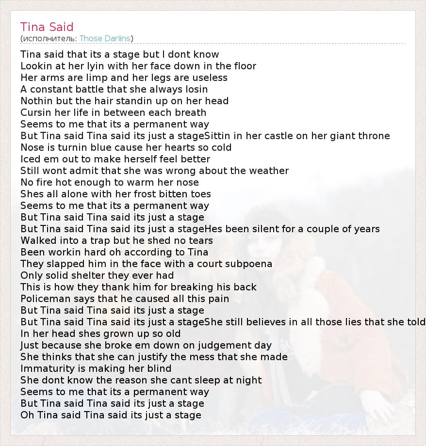 But Tina said Tina said its just a stageShe still believes in all those lies that she told