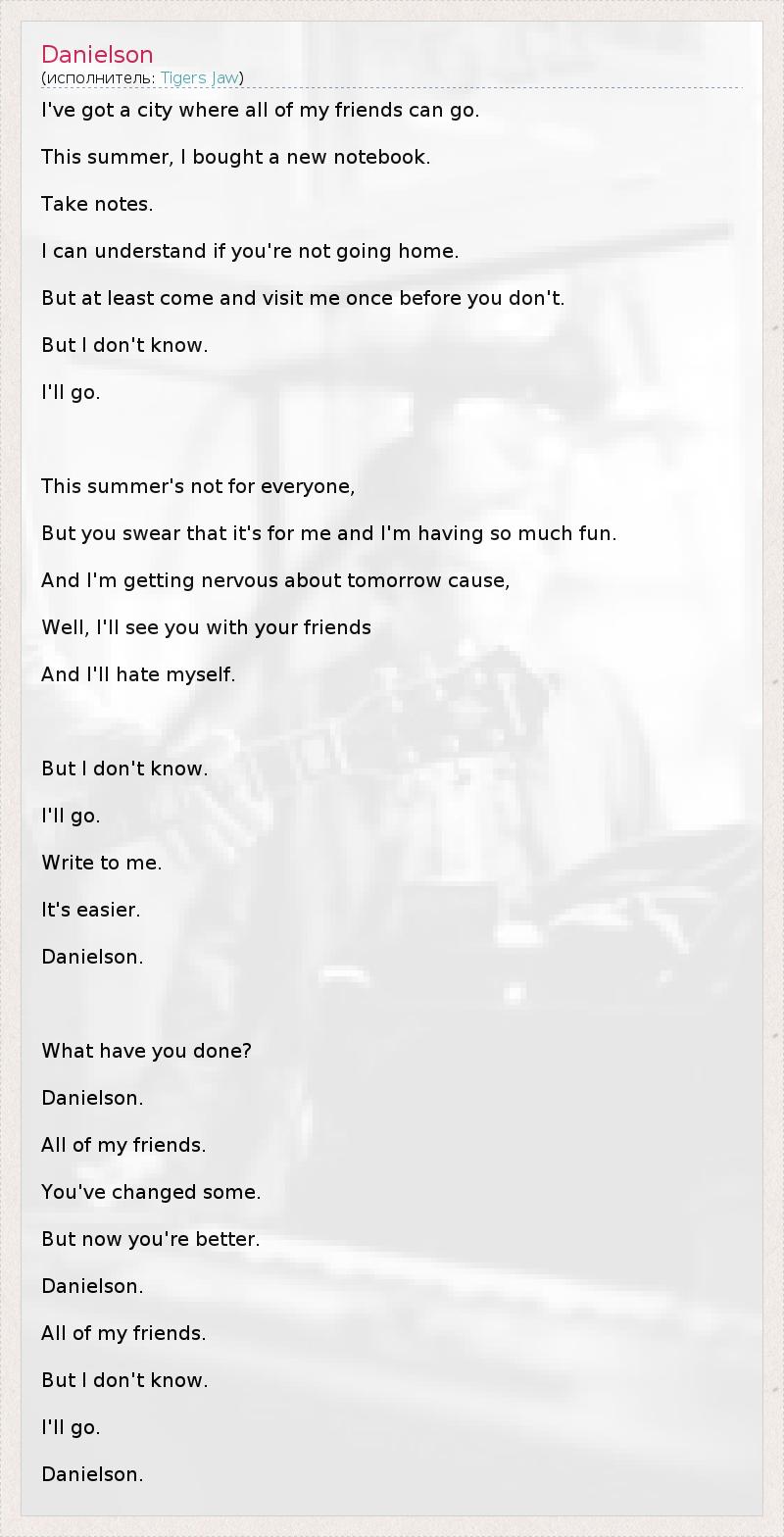 Это интересно:Почетные обладатели медали за поедание драников на скорость из города Скрентон, штат Пенсильвания. Группа играет нечто среднее между инди-роком и меланхоличным поп-панком. Согласно легенде, название Tigers Jaw появилось не абы за какой пьянкой, а на настоящей героической схватке, когда ребята голыми руками повалили тигра! Какой именно был тигр история умалчивает - быль ли он диким или плюшевым... продолжение