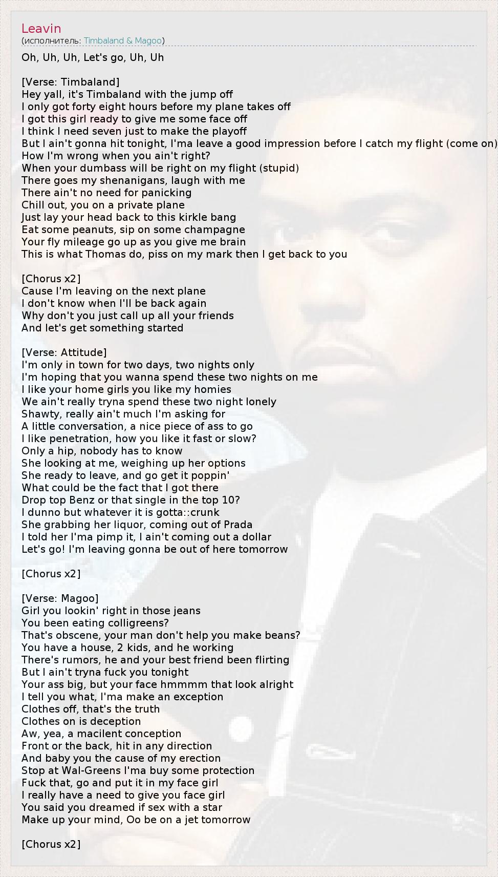 Oh, Uh, Uh, Let's go, Uh, Uh [Verse: Timbaland] Hey yall, it's Timbaland with the jump off I only got forty eight hours before my plane takes off I got this girl ready to give me some face off I think I need seven just to make the playoff But I ain't gonna hit tonight, I'ma leave a good impression before I catch my flight (come on) How I'm wrong when you ain't right? When your dumbass will be right on my flight (stupid) There goes my shenanigans, laugh with me There ain't no need for panicking Chill out, you on a private plane Just lay your head back to this kirkle bang Eat some peanuts, sip on some champagne Your fly mileage go up as you give me brain This is what Thomas do, piss on my mark then I get back to you [Chorus x2] Cause I'm leaving on the next plane I don't know when I'll be back again Why don't you just call up all your friends And let's get something started [Verse: Attitude] I'm only in town for two days, two nights only I'm hoping that you wanna spend these two nights on me I like your home girls you like my homies We ain't really tryna spend these two night lonely Shawty, really ain't much I'm asking for A little conversation, a nice piece of ass to go I like penetration, how you like it fast or slow? Only a hip, nobody has to know She looking at me, weighing up her options She ready to leave, and go get it poppin' What could be the fact that I got there Drop top Benz or that single in the top 10? I dunno but whatever it is gotta::crunk She grabbing her liquor, coming out of Prada I told her I'ma pimp it, I ain't coming out a dollar Let's go! I'm leaving gonna be out of here tomorrow [Chorus x2] [Verse: Magoo] Girl you lookin' right in those jeans You been eating colligreens? That's obscene, your man don't help you make beans? You have a house, 2 kids, and he working There's rumors, he and your best friend been flirting But I ain't tryna fuck you tonight Your ass big, but your face hmmmm that look alright I tell you what, I'ma make an exception Clothes off, that's the truth Clothes on is deception Aw, yea, a macilent conception Front or the back, hit in any direction And baby you the cause of my erection Stop at Wal-Greens I'ma buy some protection Fuck that, go and put it in my face girl I really have a need to give you face girl You said you dreamed if sex with a star Make up your mind, Oo be on a jet tomorrow [Chorus x2]