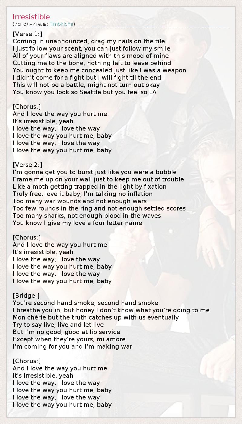 [Verse 1:] Coming in unannounced, drag my nails on the tile I just follow your scent, you can just follow my smile All of your flaws are aligned with this mood of mine Cutting me to the bone, nothing left to leave behind You ought to keep me concealed just like I was a weapon I didn't come for a fight but I will fight til the end This will not be a battle, might not turn out okay You know you look so Seattle but you feel so LA [Chorus:] And I love the way you hurt me It's irresistible, yeah I love the way, I love the way I love the way you hurt me, baby I love the way, I love the way I love the way you hurt me, baby [Verse 2:] I'm gonna get you to burst just like you were a bubble Frame me up on your wall just to keep me out of trouble Like a moth getting trapped in the light by fixation Truly free, love it baby, I'm talking no inflation Too many war wounds and not enough wars Too few rounds in the ring and not enough settled scores Too many sharks, not enough blood in the waves You know I give my love a four letter name [Chorus:] And I love the way you hurt me It's irresistible, yeah I love the way, I love the way I love the way you hurt me, baby I love the way, I love the way I love the way you hurt me, baby [Bridge:] You're second hand smoke, second hand smoke I breathe you in, but honey I don't know what you're doing to me Mon chérie but the truth catches up with us eventually Try to say live, live and let live But I'm no good, good at lip service Except when they're yours, mi amore I'm coming for you and I'm making war [Chorus:] And I love the way you hurt me It's irresistible, yeah I love the way, I love the way I love the way you hurt me, baby I love the way, I love the way I love the way you hurt me, baby