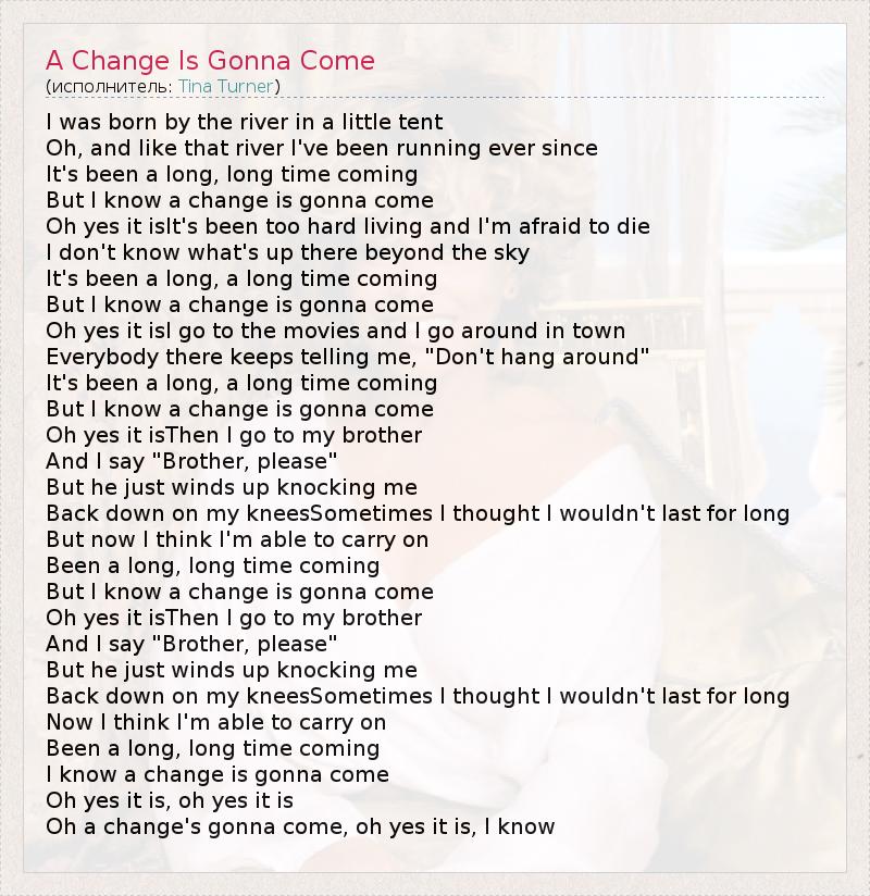 Oh a change's gonna come, oh yes it is, I know