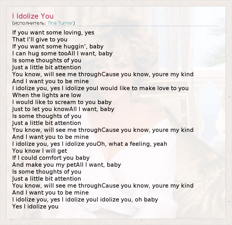 If you want some loving, yes That I'll give to you If you want some huggin', baby I can hug some tooAll I want, baby Is some thoughts of you Just a little bit attention You know, will see me throughCause you know, youre my kind And I want you to be mine I idolize you, yes I idolize youI would like to make love to you When the lights are low I would like to scream to you baby Just to let you knowAll I want, baby Is some thoughts of you Just a little bit attention You know, will see me throughCause you know, youre my kind And I want you to be mine I idolize you, yes I idolize youOh, what a feeling, yeah You know I will get If I could comfort you baby And make you my petAll I want, baby Is some thoughts of you Just a little bit attention You know, will see me throughCause you know, youre my kind And I want you to be mine I idolize you, yes I idolize youI idolize you, oh baby Yes I idolize you