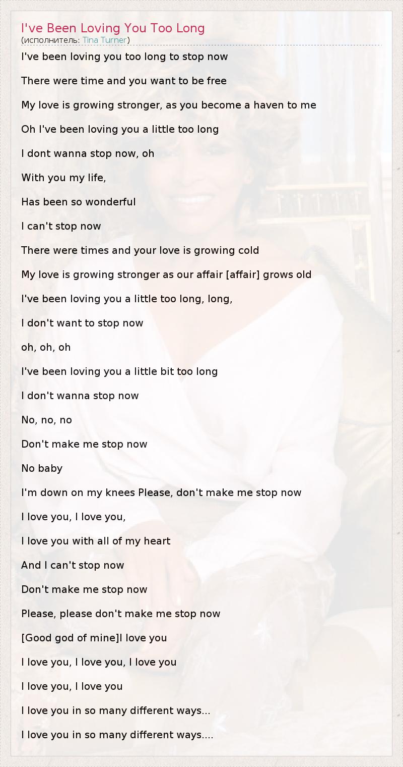 I've been loving you too long to stop now There were time and you want to be free My love is growing stronger, as you become a haven to me Oh I've been loving you a little too long I dont wanna stop now, oh With you my life, Has been so wonderful I can't stop now There were times and your love is growing cold My love is growing stronger as our affair [affair] grows old I've been loving you a little too long, long, I don't want to stop now oh, oh, oh I've been loving you a little bit too long I don't wanna stop now No, no, no Don't make me stop now No baby I'm down on my knees Please, don't make me stop now I love you, I love you, I love you with all of my heart And I can't stop now Don't make me stop now Please, please don't make me stop now [Good god of mine]I love you I love you, I love you, I love you I love you, I love you I love you in so many different ways... I love you in so many different ways....