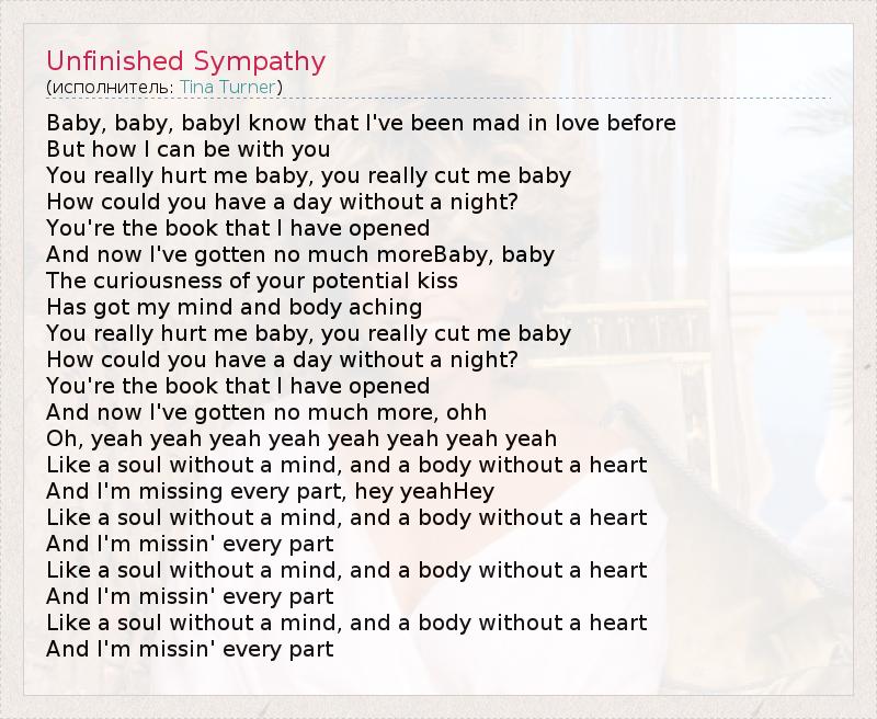 Baby, baby, babyI know that I've been mad in love before But how I can be with you You really hurt me baby, you really cut me baby How could you have a day without a night? You're the book that I have opened And now I've gotten no much moreBaby, baby The curiousness of your potential kiss Has got my mind and body aching You really hurt me baby, you really cut me baby How could you have a day without a night? You're the book that I have opened And now I've gotten no much more, ohh Oh, yeah yeah yeah yeah yeah yeah yeah yeah Like a soul without a mind, and a body without a heart And I'm missing every part, hey yeahHey Like a soul without a mind, and a body without a heart And I'm missin' every part Like a soul without a mind, and a body without a heart And I'm missin' every part Like a soul without a mind, and a body without a heart And I'm missin' every part