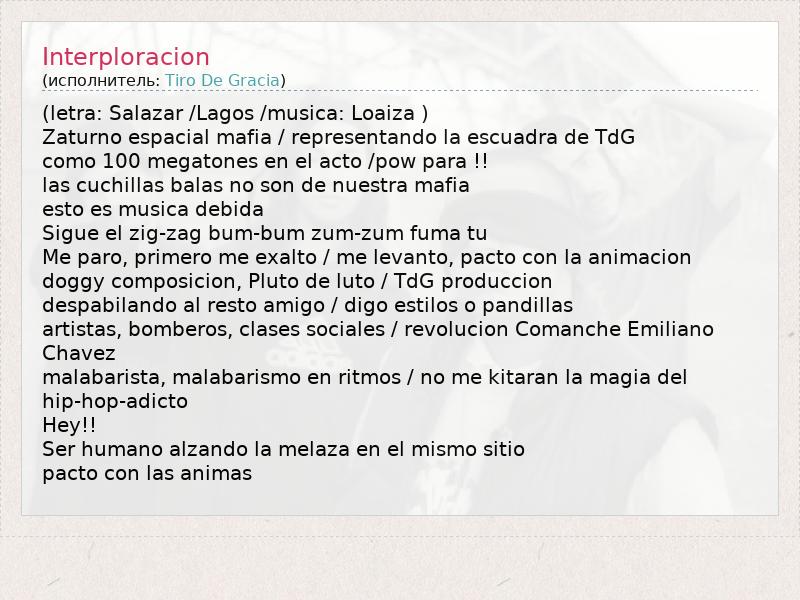 (letra: Salazar /Lagos /musica: Loaiza ) Zaturno espacial mafia / representando la escuadra de TdG como 100 megatones en el acto /pow para !! las cuchillas balas no son de nuestra mafia esto es musica debida Sigue el zig-zag bum-bum zum-zum fuma tu Me paro, primero me exalto / me levanto, pacto con la animacion doggy composicion, Pluto de luto / TdG produccion despabilando al resto amigo / digo estilos o pandillas artistas, bomberos, clases sociales / revolucion Comanche Emiliano Chavez malabarista, malabarismo en ritmos / no me kitaran la magia del hip-hop-adicto Hey!! Ser humano alzando la melaza en el mismo sitio pacto con las animas