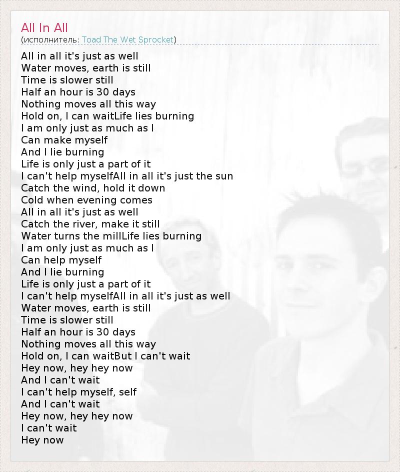 All in all it's just as well Water moves, earth is still Time is slower still Half an hour is 30 days Nothing moves all this way Hold on, I can waitLife lies burning I am only just as much as I Can make myself And I lie burning Life is only just a part of it I can't help myselfAll in all it's just the sun Catch the wind, hold it down Cold when evening comes All in all it's just as well Catch the river, make it still Water turns the millLife lies burning I am only just as much as I Can help myself And I lie burning Life is only just a part of it I can't help myselfAll in all it's just as well Water moves, earth is still Time is slower still Half an hour is 30 days Nothing moves all this way Hold on, I can waitBut I can't wait Hey now, hey hey now And I can't wait I can't help myself, self And I can't wait Hey now, hey hey now I can't wait Hey now