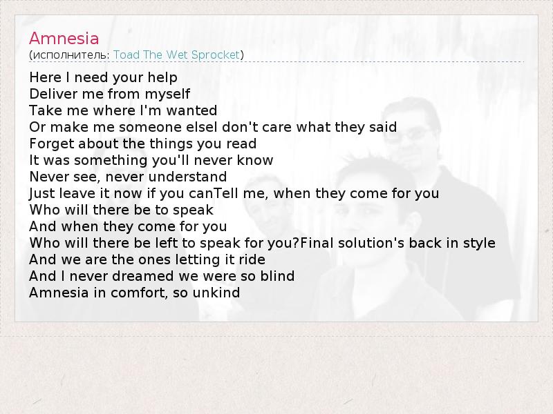 Это интересно:Toad the Wet Sprocket, американская альтернативная поп-рок-группа. Образована в 1986 в Санта-Барбаре, Калифорния. Группа была основана уроженцами Санта-Барбары, один из которых — Дин Диннинг — с рождения имел прямое отношение к музыке (его дядей был известный в 1950-е гг. «хит-мэйкер» Марк «Тин Энджел» Диннинг, Mark «Teen Angel» Dinning). После активных выступлений в городских барах, в 1988 группа записала демо-запись... продолжение