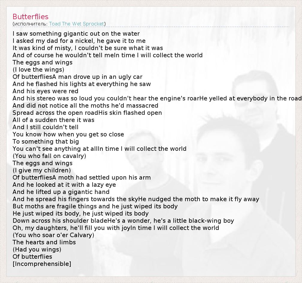 Это интересно:Toad the Wet Sprocket, американская альтернативная поп-рок-группа. Образована в 1986 в Санта-Барбаре, Калифорния. Группа была основана уроженцами Санта-Барбары, один из которых — Дин Диннинг — с рождения имел прямое отношение к музыке (его дядей был известный в 1950-е гг. «хит-мэйкер» Марк «Тин Энджел» Диннинг, Mark «Teen Angel» Dinning). После активных выступлений в городских барах, в 1988 группа записала демо-запись... продолжение