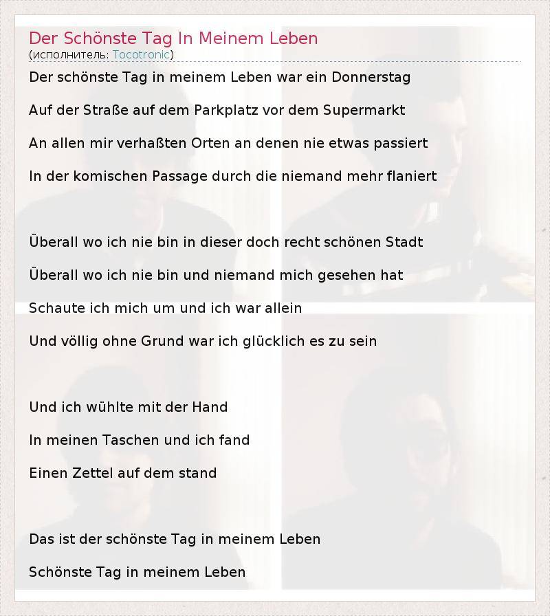 Der schönste Tag in meinem Leben war ein Donnerstag Auf der Straße auf dem Parkplatz vor dem Supermarkt An allen mir verhaßten Orten an denen nie etwas passiert In der komischen Passage durch die niemand mehr flaniert Überall wo ich nie bin in dieser doch recht schönen Stadt Überall wo ich nie bin und niemand mich gesehen hat Schaute ich mich um und ich war allein Und völlig ohne Grund war ich glücklich es zu sein Und ich wühlte mit der Hand In meinen Taschen und ich fand Einen Zettel auf dem stand Das ist der schönste Tag in meinem Leben Schönste Tag in meinem Leben