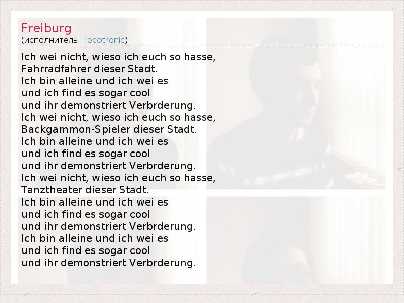 Ich wei nicht, wieso ich euch so hasse, Fahrradfahrer dieser Stadt. Ich bin alleine und ich wei es und ich find es sogar cool und ihr demonstriert Verbrderung. Ich wei nicht, wieso ich euch so hasse, Backgammon-Spieler dieser Stadt. Ich bin alleine und ich wei es und ich find es sogar cool und ihr demonstriert Verbrderung. Ich wei nicht, wieso ich euch so hasse, Tanztheater dieser Stadt. Ich bin alleine und ich wei es und ich find es sogar cool und ihr demonstriert Verbrderung. Ich bin alleine und ich wei es und ich find es sogar cool und ihr demonstriert Verbrderung.