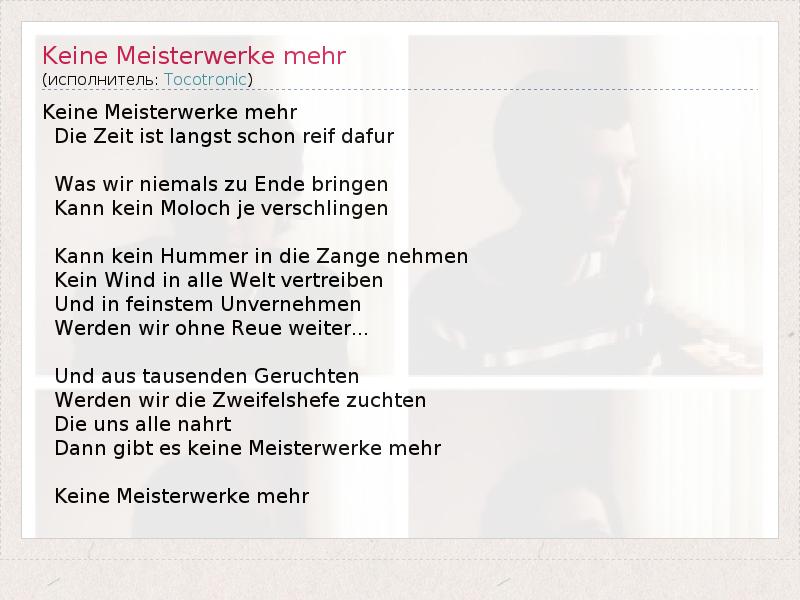 А как ты думаешь, о чем песня "Keine Meisterwerke mehr" ?