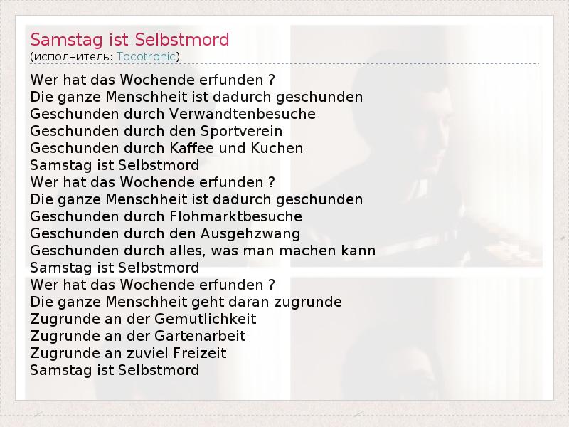 А как ты думаешь, о чем песня "Samstag ist Selbstmord" ?
