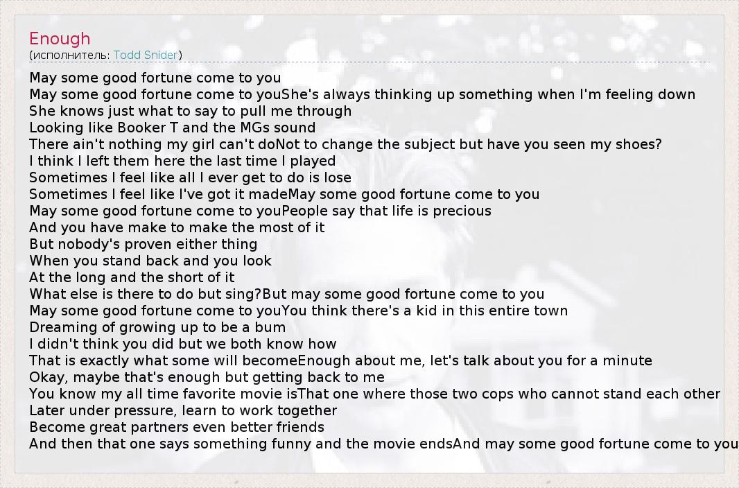 May some good fortune come to you May some good fortune come to youShe's always thinking up something when I'm feeling down She knows just what to say to pull me through Looking like Booker T and the MGs sound There ain't nothing my girl can't doNot to change the subject but have you seen my shoes? I think I left them here the last time I played Sometimes I feel like all I ever get to do is lose Sometimes I feel like I've got it madeMay some good fortune come to you May some good fortune come to youPeople say that life is precious And you have make to make the most of it But nobody's proven either thing When you stand back and you look At the long and the short of it What else is there to do but sing?But may some good fortune come to you May some good fortune come to youYou think there's a kid in this entire town Dreaming of growing up to be a bum I didn't think you did but we both know how That is exactly what some will becomeEnough about me, let's talk about you for a minute Okay, maybe that's enough but getting back to me You know my all time favorite movie isThat one where those two cops who cannot stand each other Later under pressure, learn to work together Become great partners even better friends And then that one says something funny and the movie endsAnd may some good fortune come to you