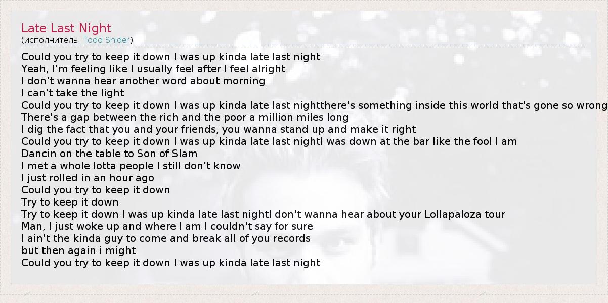 Could you try to keep it down I was up kinda late last night Yeah, I'm feeling like I usually feel after I feel alright I don't wanna hear another word about morning I can't take the light Could you try to keep it down I was up kinda late last nightthere's something inside this world that's gone so wrong There's a gap between the rich and the poor a million miles long I dig the fact that you and your friends, you wanna stand up and make it right Could you try to keep it down I was up kinda late last nightI was down at the bar like the fool I am Dancin on the table to Son of Slam I met a whole lotta people I still don't know I just rolled in an hour ago Could you try to keep it down Try to keep it down Try to keep it down I was up kinda late last nightI don't wanna hear about your Lollapaloza tour Man, I just woke up and where I am I couldn't say for sure I ain't the kinda guy to come and break all of you records but then again i might Could you try to keep it down I was up kinda late last night