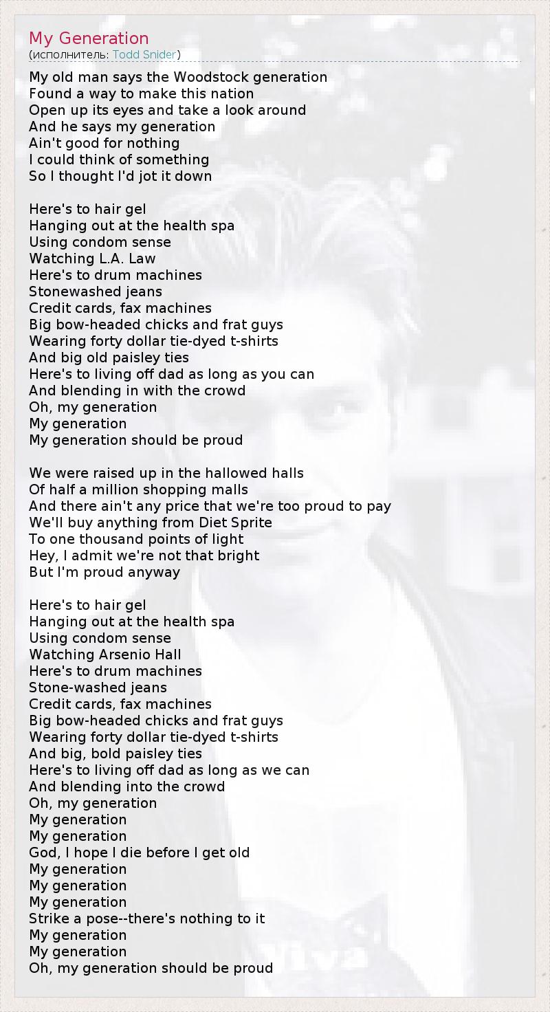 My old man says the Woodstock generation Found a way to make this nation Open up its eyes and take a look around And he says my generation Ain't good for nothing I could think of something So I thought I'd jot it down Here's to hair gel Hanging out at the health spa Using condom sense Watching L.A. Law Here's to drum machines Stonewashed jeans Credit cards, fax machines Big bow-headed chicks and frat guys Wearing forty dollar tie-dyed t-shirts And big old paisley ties Here's to living off dad as long as you can And blending in with the crowd Oh, my generation My generation My generation should be proud We were raised up in the hallowed halls Of half a million shopping malls And there ain't any price that we're too proud to pay We'll buy anything from Diet Sprite To one thousand points of light Hey, I admit we're not that bright But I'm proud anyway Here's to hair gel Hanging out at the health spa Using condom sense Watching Arsenio Hall Here's to drum machines Stone-washed jeans Credit cards, fax machines Big bow-headed chicks and frat guys Wearing forty dollar tie-dyed t-shirts And big, bold paisley ties Here's to living off dad as long as we can And blending into the crowd Oh, my generation My generation My generation God, I hope I die before I get old My generation My generation My generation Strike a pose--there's nothing to it My generation My generation Oh, my generation should be proud