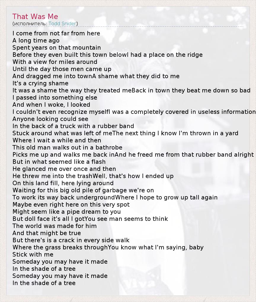 I come from not far from here A long time ago Spent years on that mountain Before they even built this town belowI had a place on the ridge With a view for miles around Until the day those men came up And dragged me into townA shame what they did to me It's a crying shame It was a shame the way they treated meBack in town they beat me down so bad I passed into something else And when I woke, I looked I couldn't even recognize myselfI was a completely covered in useless information Anyone looking could see In the back of a truck with a rubber band Stuck around what was left of meThe next thing I know I'm thrown in a yard Where I wait a while and then This old man walks out in a bathrobe Picks me up and walks me back inAnd he freed me from that rubber band alright But in what seemed like a flash He glanced me over once and then He threw me into the trashWell, that's how I ended up On this land fill, here lying around Waiting for this big old pile of garbage we're on To work its way back undergroundWhere I hope to grow up tall again Maybe even right here on this very spot Might seem like a pipe dream to you But doll face it's all I gotYou see man seems to think The world was made for him And that might be true But there's is a crack in every side walk Where the grass breaks throughYou know what I'm saying, baby Stick with me Someday you may have it made In the shade of a tree Someday you may have it made In the shade of a tree