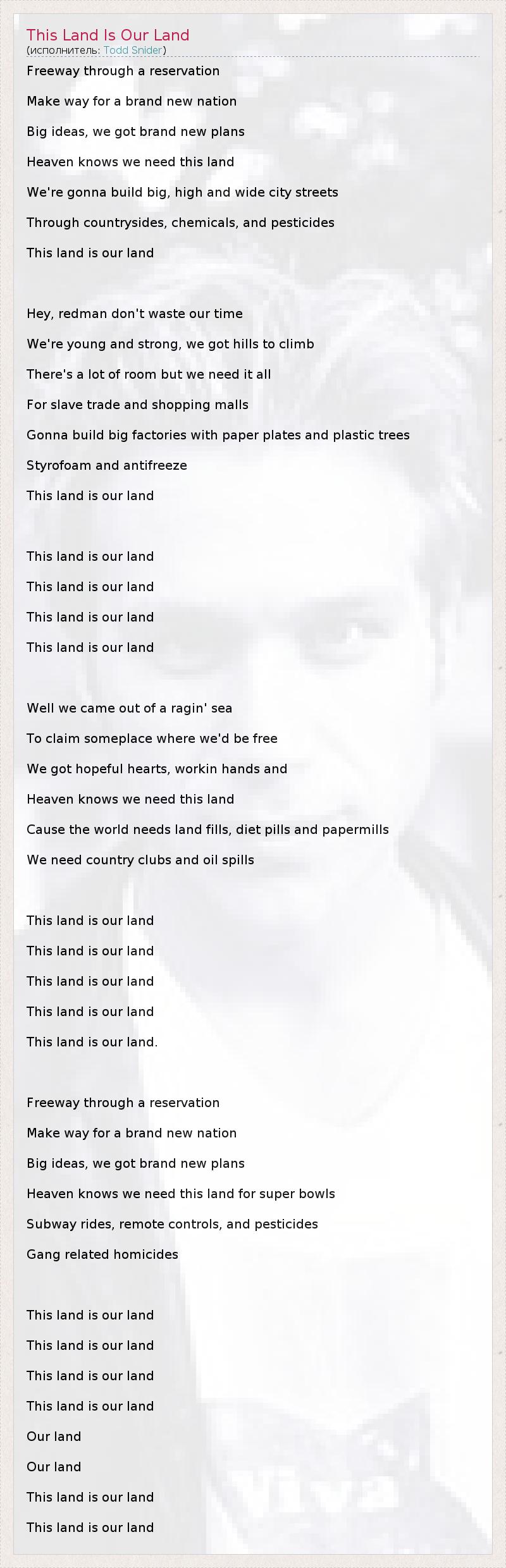 Freeway through a reservation Make way for a brand new nation Big ideas, we got brand new plans Heaven knows we need this land We're gonna build big, high and wide city streets Through countrysides, chemicals, and pesticides This land is our land Hey, redman don't waste our time We're young and strong, we got hills to climb There's a lot of room but we need it all For slave trade and shopping malls Gonna build big factories with paper plates and plastic trees Styrofoam and antifreeze This land is our land This land is our land This land is our land This land is our land This land is our land Well we came out of a ragin' sea To claim someplace where we'd be free We got hopeful hearts, workin hands and Heaven knows we need this land Cause the world needs land fills, diet pills and papermills We need country clubs and oil spills This land is our land This land is our land This land is our land This land is our land This land is our land. Freeway through a reservation Make way for a brand new nation Big ideas, we got brand new plans Heaven knows we need this land for super bowls Subway rides, remote controls, and pesticides Gang related homicides This land is our land This land is our land This land is our land This land is our land Our land Our land This land is our land This land is our land