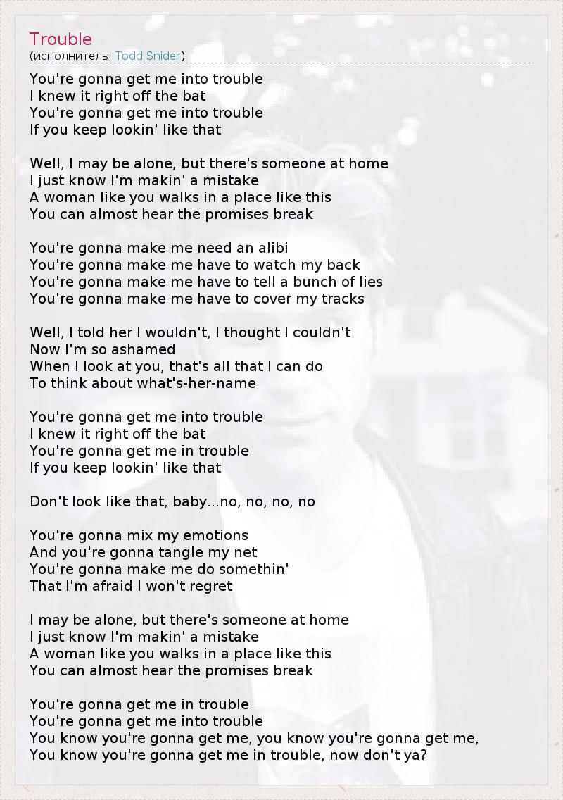 You're gonna get me into trouble I knew it right off the bat You're gonna get me into trouble If you keep lookin' like that Well, I may be alone, but there's someone at home I just know I'm makin' a mistake A woman like you walks in a place like this You can almost hear the promises break You're gonna make me need an alibi You're gonna make me have to watch my back You're gonna make me have to tell a bunch of lies You're gonna make me have to cover my tracks Well, I told her I wouldn't, I thought I couldn't Now I'm so ashamed When I look at you, that's all that I can do To think about what's-her-name You're gonna get me into trouble I knew it right off the bat You're gonna get me in trouble If you keep lookin' like that Don't look like that, baby...no, no, no, no You're gonna mix my emotions And you're gonna tangle my net You're gonna make me do somethin' That I'm afraid I won't regret I may be alone, but there's someone at home I just know I'm makin' a mistake A woman like you walks in a place like this You can almost hear the promises break You're gonna get me in trouble You're gonna get me into trouble You know you're gonna get me, you know you're gonna get me, You know you're gonna get me in trouble, now don't ya?
