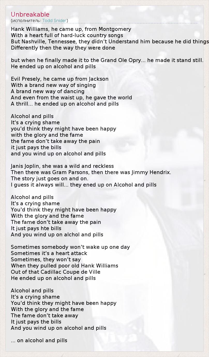 Hank Williams, he came up, from Montgomery With a heart full of hard-luck country songs But Nashville, Tennessee, they didn't Understand him because he did things Differently then the way they were done but when he finally made it to the Grand Ole Opry... he made it stand still. He ended up on alcohol and pills Evil Presely, he came up from Jackson With a brand new way of singing A brand new way of dancing And even from the waist up, he gave the world A thrill... he ended up on alcohol and pills Alcohol and pills It's a crying shame you'd think they might have been happy with the glory and the fame the fame don't take away the pain it just pays the bills and you wind up on alcohol and pills Janis Joplin, she was a wild and reckless Then there was Gram Parsons, then there was Jimmy Hendrix. The story just goes on and on. I guess it always will... they ened up on Alcohol and pills Alcohol and pills It's a crying shame You'd think they might have been happy With the glory and the fame The fame don't take away the pain It just pays hte bills And you wind up on alchol and pills Sometimes somebody won't wake up one day Sometimes it's a heart attack Sometimes, they won't say When they pulled poor old Hank Williams Out of that Cadillac Coupe de Ville He ended up on alcohol and pills Alcohol and pills It's a crying shame You'd think they might have been happy With the glory and the fame The fame don't take away It just pays the bills And you wind up on alcohol and pills ... on alcohol and pills