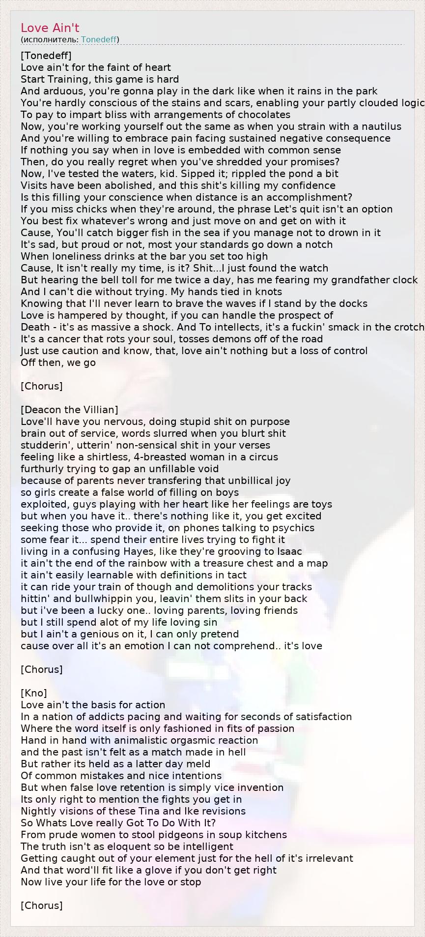 [Tonedeff] Love ain't for the faint of heart Start Training, this game is hard And arduous, you're gonna play in the dark like when it rains in the park You're hardly conscious of the stains and scars, enabling your partly clouded logic To pay to impart bliss with arrangements of chocolates Now, you're working yourself out the same as when you strain with a nautilus And you're willing to embrace pain facing sustained negative consequence If nothing you say when in love is embedded with common sense Then, do you really regret when you've shredded your promises? Now, I've tested the waters, kid. Sipped it; rippled the pond a bit Visits have been abolished, and this shit's killing my confidence Is this filling your conscience when distance is an accomplishment? If you miss chicks when they're around, the phrase Let's quit isn't an option You best fix whatever's wrong and just move on and get on with it Cause, You'll catch bigger fish in the sea if you manage not to drown in it It's sad, but proud or not, most your standards go down a notch When loneliness drinks at the bar you set too high Cause, It isn't really my time, is it? Shit...I just found the watch But hearing the bell toll for me twice a day, has me fearing my grandfather clock And I can't die without trying. My hands tied in knots Knowing that I'll never learn to brave the waves if I stand by the docks Love is hampered by thought, if you can handle the prospect of Death - it's as massive a shock. And To intellects, it's a fuckin' smack in the crotch It's a cancer that rots your soul, tosses demons off of the road Just use caution and know, that, love ain't nothing but a loss of control Off then, we go [Chorus] [Deacon the Villian] Love'll have you nervous, doing stupid shit on purpose brain out of service, words slurred when you blurt shit studderin', utterin' non-sensical shit in your verses feeling like a shirtless, 4-breasted woman in a circus furthurly trying to gap an unfillable void because of parents never transfering that unbillical joy so girls create a false world of filling on boys exploited, guys playing with her heart like her feelings are toys but when you have it.. there's nothing like it, you get excited seeking those who provide it, on phones talking to psychics some fear it... spend their entire lives trying to fight it living in a confusing Hayes, like they're grooving to Isaac it ain't the end of the rainbow with a treasure chest and a map it ain't easily learnable with definitions in tact it can ride your train of though and demolitions your tracks hittin' and bullwhippin you, leavin' them slits in your back but i've been a lucky one.. loving parents, loving friends but I still spend alot of my life loving sin but I ain't a genious on it, I can only pretend cause over all it's an emotion I can not comprehend.. it's love [Chorus] [Kno] Love ain't the basis for action In a nation of addicts pacing and waiting for seconds of satisfaction Where the word itself is only fashioned in fits of passion Hand in hand with animalistic orgasmic reaction and the past isn't felt as a match made in hell But rather its held as a latter day meld Of common mistakes and nice intentions But when false love retention is simply vice invention Its only right to mention the fights you get in Nightly visions of these Tina and Ike revisions So Whats Love really Got To Do With It? From prude women to stool pidgeons in soup kitchens The truth isn't as eloquent so be intelligent Getting caught out of your element just for the hell of it's irrelevant And that word'll fit like a glove if you don't get right Now live your life for the love or stop [Chorus]