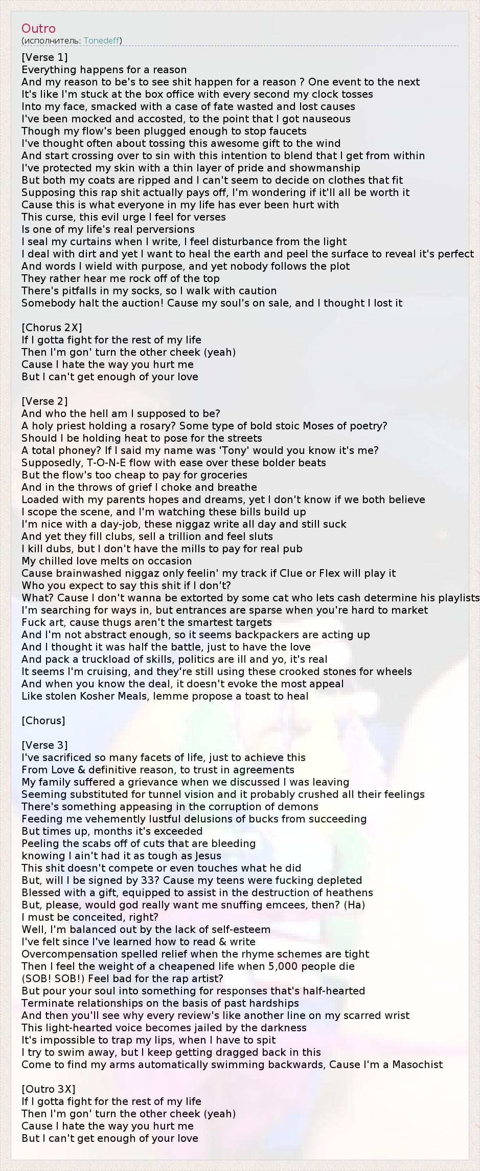 [Verse 1] Everything happens for a reason And my reason to be's to see shit happen for a reason ? One event to the next It's like I'm stuck at the box office with every second my clock tosses Into my face, smacked with a case of fate wasted and lost causes I've been mocked and accosted, to the point that I got nauseous Though my flow's been plugged enough to stop faucets I've thought often about tossing this awesome gift to the wind And start crossing over to sin with this intention to blend that I get from within I've protected my skin with a thin layer of pride and showmanship But both my coats are ripped and I can't seem to decide on clothes that fit Supposing this rap shit actually pays off, I'm wondering if it'll all be worth it Cause this is what everyone in my life has ever been hurt with This curse, this evil urge I feel for verses Is one of my life's real perversions I seal my curtains when I write, I feel disturbance from the light I deal with dirt and yet I want to heal the earth and peel the surface to reveal it's perfect And words I wield with purpose, and yet nobody follows the plot They rather hear me rock off of the top There's pitfalls in my socks, so I walk with caution Somebody halt the auction! Cause my soul's on sale, and I thought I lost it [Chorus 2X] If I gotta fight for the rest of my life Then I'm gon' turn the other cheek (yeah) Cause I hate the way you hurt me But I can't get enough of your love [Verse 2] And who the hell am I supposed to be? A holy priest holding a rosary? Some type of bold stoic Moses of poetry? Should I be holding heat to pose for the streets A total phoney? If I said my name was 'Tony' would you know it's me? Supposedly, T-O-N-E flow with ease over these bolder beats But the flow's too cheap to pay for groceries And in the throws of grief I choke and breathe Loaded with my parents hopes and dreams, yet I don't know if we both believe I scope the scene, and I'm watching these bills build up I'm nice with a day-job, these niggaz write all day and still suck And yet they fill clubs, sell a trillion and feel sluts I kill dubs, but I don't have the mills to pay for real pub My chilled love melts on occasion Cause brainwashed niggaz only feelin' my track if Clue or Flex will play it Who you expect to say this shit if I don't? What? Cause I don't wanna be extorted by some cat who lets cash determine his playlists I'm searching for ways in, but entrances are sparse when you're hard to market Fuck art, cause thugs aren't the smartest targets And I'm not abstract enough, so it seems backpackers are acting up And I thought it was half the battle, just to have the love And pack a truckload of skills, politics are ill and yo, it's real It seems I'm cruising, and they're still using these crooked stones for wheels And when you know the deal, it doesn't evoke the most appeal Like stolen Kosher Meals, lemme propose a toast to heal [Chorus] [Verse 3] I've sacrificed so many facets of life, just to achieve this From Love & definitive reason, to trust in agreements My family suffered a grievance when we discussed I was leaving Seeming substituted for tunnel vision and it probably crushed all their feelings There's something appeasing in the corruption of demons Feeding me vehemently lustful delusions of bucks from succeeding But times up, months it's exceeded Peeling the scabs off of cuts that are bleeding knowing I ain't had it as tough as Jesus This shit doesn't compete or even touches what he did But, will I be signed by 33? Cause my teens were fucking depleted Blessed with a gift, equipped to assist in the destruction of heathens But, please, would god really want me snuffing emcees, then? (Ha) I must be conceited, right? Well, I'm balanced out by the lack of self-esteem I've felt since I've learned how to read & write Overcompensation spelled relief when the rhyme schemes are tight Then I feel the weight of a cheapened life when 5,000 people die (SOB! SOB!) Feel bad for the rap artist? But pour your soul into something for responses that's half-hearted Terminate relationships on the basis of past hardships And then you'll see why every review's like another line on my scarred wrist This light-hearted voice becomes jailed by the darkness It's impossible to trap my lips, when I have to spit I try to swim away, but I keep getting dragged back in this Come to find my arms automatically swimming backwards, Cause I'm a Masochist [Outro 3X] If I gotta fight for the rest of my life Then I'm gon' turn the other cheek (yeah) Cause I hate the way you hurt me But I can't get enough of your love