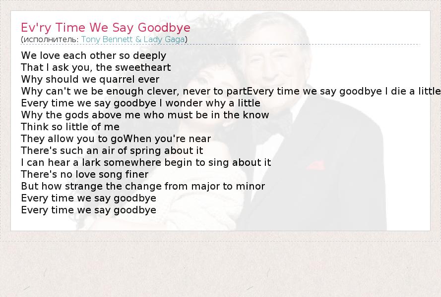 We love each other so deeply That I ask you, the sweetheart Why should we quarrel ever Why can't we be enough clever, never to partEvery time we say goodbye I die a little Every time we say goodbye I wonder why a little Why the gods above me who must be in the know Think so little of me They allow you to goWhen you're near There's such an air of spring about it I can hear a lark somewhere begin to sing about it There's no love song finer But how strange the change from major to minor Every time we say goodbye Every time we say goodbye