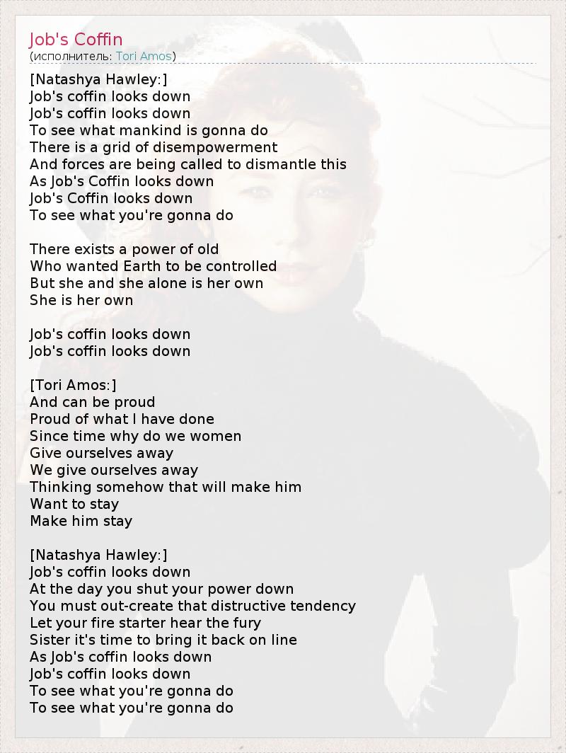 [Natashya Hawley:] Job's coffin looks down Job's coffin looks down To see what mankind is gonna do There is a grid of disempowerment And forces are being called to dismantle this As Job's Coffin looks down Job's Coffin looks down To see what you're gonna do There exists a power of old Who wanted Earth to be controlled But she and she alone is her own She is her own Job's coffin looks down Job's coffin looks down [Tori Amos:] And can be proud Proud of what I have done Since time why do we women Give ourselves away We give ourselves away Thinking somehow that will make him Want to stay Make him stay [Natashya Hawley:] Job's coffin looks down At the day you shut your power down You must out-create that distructive tendency Let your fire starter hear the fury Sister it's time to bring it back on line As Job's coffin looks down Job's coffin looks down To see what you're gonna do To see what you're gonna do