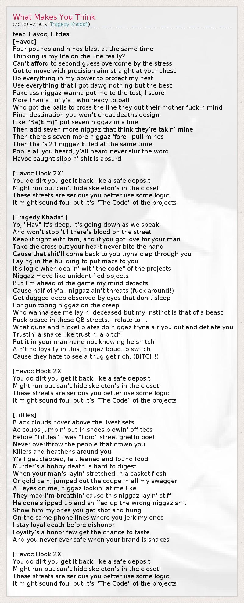 feat. Havoc, Littles [Havoc] Four pounds and nines blast at the same time Thinking is my life on the line really? Can't afford to second guess overcome by the stress Got to move with precision aim straight at your chest Do everything in my power to protect my nest Use everything that I got dawg nothing but the best Fake ass niggaz wanna put me to the test, I score More than all of y'all who ready to ball Who got the balls to cross the line they out their mother fuckin mind Final destination you won't cheat deaths design Like "Ra(kim)" put seven niggaz in a line Then add seven more niggaz that think they're takin' mine Then there's seven more niggaz 'fore I pull mines Then that's 21 niggaz killed at the same time Pop is all you heard, y'all heard never slur the word Havoc caught slippin' shit is absurd [Havoc Hook 2X] You do dirt you get it back like a safe deposit Might run but can't hide skeleton's in the closet These streets are serious you better use some logic It might sound foul but it's "The Code" of the projects [Tragedy Khadafi] Yo, "Hav" it's deep, it's going down as we speak And won't stop 'til there's blood on the street Keep it tight with fam, and if you got love for your man Take the cross out your heart never bite the hand Cause that shit'll come back to you tryna clap through you Laying in the building to put macs to you It's logic when dealin' wit "the code" of the projects Niggaz move like unidentified objects But I'm ahead of the game my mind detects Cause half of y'all niggaz ain't threats (fuck around!) Get dugged deep observed by eyes that don't sleep For gun toting niggaz on the creep Who wanna see me layin' deceased but my instinct is that of a beast Fuck peace in these QB streets, I relate to . . What guns and nickel plates do niggaz tryna air you out and deflate you Trustin' a snake like trustin' a bitch Put it in your man hand not knowing he snitch Ain't no loyalty in this, niggaz boud to switch Cause they hate to see a thug get rich, (BITCH!) [Havoc Hook 2X] You do dirt you get it back like a safe deposit Might run but can't hide skeleton's in the closet These streets are serious you better use some logic It might sound foul but it's "The Code" of the projects [Littles] Black clouds hover above the livest sets Ac coups jumpin' out in shoes blowin' off tecs Before "Littles" I was "Lord" street ghetto poet Never overthrow the people that crown you Killers and heathens around you Y'all get clapped, left leaned and found food Murder's a hobby death is hard to digest When your man's layin' stretched in a casket flesh Or gold cain, jumped out the coupe in all my swagger All eyes on me, niggaz lookin' at me like They mad I'm breathin' cause this niggaz layin' stiff He done slipped up and sniffed up the wrong niggaz shit Show him my ones you get shot and hung On the same phone lines where you jerk my ones I stay loyal death before dishonor Loyalty's a honor few get the chance to taste And you never ever safe when your brand is snakes [Havoc Hook 2X] You do dirt you get it back like a safe deposit Might run but can't hide skeleton's in the closet These streets are serious you better use some logic It might sound foul but it's "The Code" of the projects