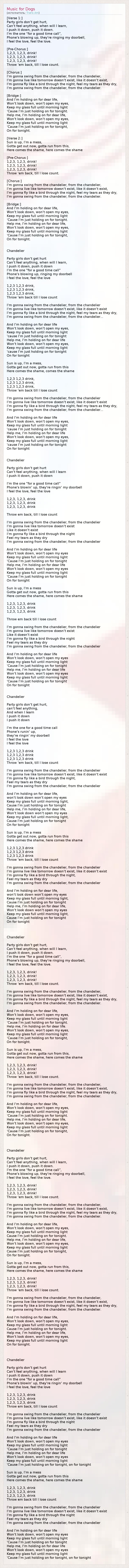 [Verse 1:] Party girls don't get hurt, Can't feel anything, when will I learn, I push it down, push it down. I'm the one “for a good time call”, Phone's blowing up, they're ringing my doorbell, I feel the love, feel the love. [Pre-Chorus:] 1,2,3, 1,2,3, drink! 1,2,3, 1,2,3, drink! 1,2,3, 1,2,3, drink! Throw ‘em back, till I lose count. [Chorus:] I'm gonna swing from the chandelier, from the chandelier, I'm gonna live like tomorrow doesn't exist, like it doesn't exist, I'm gonna fly like a bird through the night, feel my tears as they dry, I'm gonna swing from the chandelier, from the chandelier. [Bridge:] And I'm holding on for dear life, Won't look down, won't open my eyes, Keep my glass full until morning light ‘Cause I'm just holding on for tonight. Help me, I'm holding on for dear life, Won't look down, won't open my eyes, Keep my glass full until morning light ‘Cause I'm just holding on for tonight, On for tonight. [Verse 2:] Sun is up, I'm a mess, Gotta get out now, gotta run from this, Here comes the shame, here comes the shame [Pre-Chorus:] 1,2,3, 1,2,3, drink! 1,2,3, 1,2,3, drink! 1,2,3, 1,2,3, drink! Throw ‘em back, till I lose count. [Chorus:] I'm gonna swing from the chandelier, from the chandelier, I'm gonna live like tomorrow doesn't exist, like it doesn't exist, I'm gonna fly like a bird through the night, feel my tears as they dry, I'm gonna swing from the chandelier, from the chandelier. [Bridge:] And I'm holding on for dear life, Won't look down, won't open my eyes, Keep my glass full until morning light ‘Cause I'm just holding on for tonight. Help me, I'm holding on for dear life, Won't look down, won't open my eyes, Keep my glass full until morning light ‘Cause I'm just holding on for tonight, On for tonight. Chandelier Party girls don't get hurt Can't feel anything, when will I learn, I push it down, push it down I'm the one "for a good time call" Phone's blowing up, ringing my doorbell I feel the love, feel the love 1,2,3 1,2,3 drink, 1,2,3 1,2,3 drink, 1,2,3 1,2,3 drink, Throw 'em back till I lose count I'm gonna swing from the chandelier, from the chandelier I'm gonna live like tomorrow doesn't exist, like it doesn't exist I'm gonna fly like a bird through the night, feel my tears as they dry, I'm gonna swing from the chandelier, from the chandelier... And I'm holding on for dear life Won't look down, won't open my eyes, Keep my glass full until morning light 'cause I'm just holding on for tonight Help me, I'm holding on for dear life Won't look down, won't open my eyes, Keep my glass full until morning light 'cause I'm just holding on for tonight On for tonight Sun is up, I'm a mess, Gotta get out now, gotta run from this Here comes the shame, comes the shame 1,2,3 1,2,3 drink, 1,2,3 1,2,3 drink, 1,2,3 1,2,3 drink, Throw 'em back till I lose count I'm gonna swing from the chandelier, from the chandelier I'm gonna live like tomorrow doesn't exist, like it doesn't exist I'm gonna fly like a bird through the night, feel my tears as they dry, I'm gonna swing from the chandelier, from the chandelier... And I'm holding on for dear life Won't look down, won't open my eyes, Keep my glass full until morning light 'cause I'm just holding on for tonight Help me, I'm holding on for dear life Won't look down, won't open my eyes, Keep my glass full until morning light 'cause I'm just holding on for tonight On for tonight Chandelier Party girls don't get hurt Can't feel anything, when will I learn I push it down, push it down I'm the one "for a good time call" Phone's blowin' up, they're ringin' my doorbell I feel the love, feel the love 1,2,3, 1,2,3, drink 1,2,3, 1,2,3, drink 1,2,3, 1,2,3, drink Throw em back, till I lose count I'm gonna swing from the chandelier, from the chandelier I'm gonna live like tomorrow doesn't exist Like it doesn't exist I'm gonna fly like a bird through the night Feel my tears as they dry I'm gonna swing from the chandelier, from the chandelier And I'm holding on for dear life Won't look down, won't open my eyes Keep my glass full until morning light 'Cause I'm just holding on for tonight Help me, I'm holding on for dear life Won't look down, won't open my eyes Keep my glass full until morning light 'Cause I'm just holding on for tonight On for tonight Sun is up, I'm a mess Gotta get out now, gotta run from this Here comes the shame, here comes the shame 1,2,3, 1,2,3, drink 1,2,3, 1,2,3, drink 1,2,3, 1,2,3, drink Throw em back till I lose count I'm gonna swing from the chandelier, from the chandelier I'm gonna live like tomorrow doesn't exist Like it doesn't exist I'm gonna fly like a bird through the night Feel my tears as they dry I'm gonna swing from the chandelier, from the chandelier And I'm holding on for dear life Won't look down, won't open my eyes Keep my glass full until morning light 'Cause I'm just holding on for tonight Help me, I'm holding on for dear life Won't look down, won't open my eyes Keep my glass full until morning light 'Cause I'm just holding on for tonight On for tonight Chandelier Party girls don't get hurt, can't feel anything, And when I learn I push it down I push it down I'm the one for a good time call Phone's runin' up, they're ringin' my doorbell I feel the love I feel the love 1,2,3 1,2,3 drink 1,2,3 1,2,3 drink 1,2,3 1,2,3 drink Throw 'em back, till I lose count I'm gonna swing from the chandelier, from the chandelier I'm gonna live like tomorrow doesn't exist, like it doesn't exist I'm gonna fly like a bird through the night, Feel my tears as they dry I'm gonna swing from the chandelier, from the chandelier And I'm holding on for dear life, won't look down won't open my eyes Keep my glass full until morning light, Cause I'm just holding on for tonight Help me, I'm holding on for dear life, Won't look down won't open my eyes Keep my glass full until morning light, Cause I'm just holding on for tonight On for tonight Sun is up, I'm a mess Gotta get out now, gotta run from this Here comes the shame, 