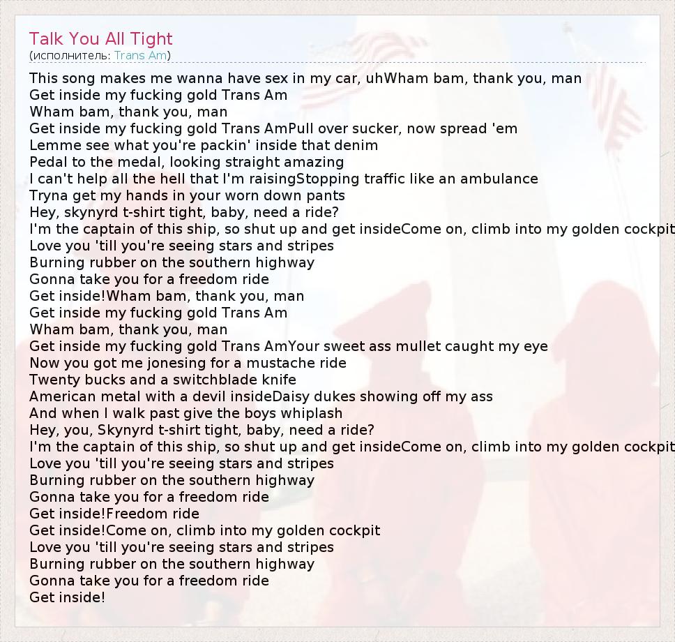 This song makes me wanna have sex in my car, uhWham bam, thank you, man Get inside my fucking gold Trans Am Wham bam, thank you, man Get inside my fucking gold Trans AmPull over sucker, now spread 'em Lemme see what you're packin' inside that denim Pedal to the medal, looking straight amazing I can't help all the hell that I'm raisingStopping traffic like an ambulance Tryna get my hands in your worn down pants Hey, skynyrd t-shirt tight, baby, need a ride? I'm the captain of this ship, so shut up and get insideCome on, climb into my golden cockpit Love you 'till you're seeing stars and stripes Burning rubber on the southern highway Gonna take you for a freedom ride Get inside!Wham bam, thank you, man Get inside my fucking gold Trans Am Wham bam, thank you, man Get inside my fucking gold Trans AmYour sweet ass mullet caught my eye Now you got me jonesing for a mustache ride Twenty bucks and a switchblade knife American metal with a devil insideDaisy dukes showing off my ass And when I walk past give the boys whiplash Hey, you, Skynyrd t-shirt tight, baby, need a ride? I'm the captain of this ship, so shut up and get insideCome on, climb into my golden cockpit Love you 'till you're seeing stars and stripes Burning rubber on the southern highway Gonna take you for a freedom ride Get inside!Freedom ride Get inside!Come on, climb into my golden cockpit Love you 'till you're seeing stars and stripes Burning rubber on the southern highway Gonna take you for a freedom ride Get inside!