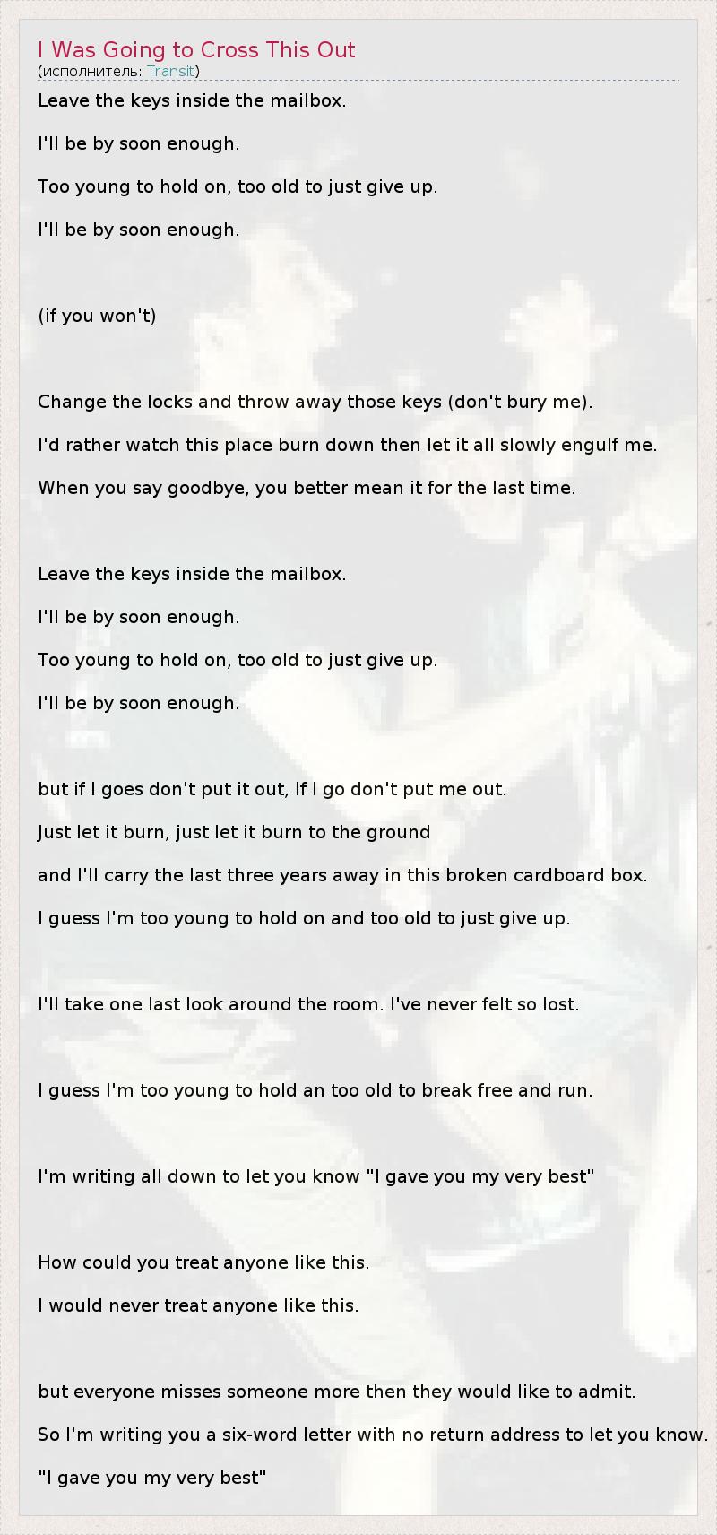 Leave the keys inside the mailbox. I'll be by soon enough. Too young to hold on, too old to just give up. I'll be by soon enough. (if you won't) Change the locks and throw away those keys (don't bury me). I'd rather watch this place burn down then let it all slowly engulf me. When you say goodbye, you better mean it for the last time. Leave the keys inside the mailbox. I'll be by soon enough. Too young to hold on, too old to just give up. I'll be by soon enough. but if I goes don't put it out, If I go don't put me out. Just let it burn, just let it burn to the ground and I'll carry the last three years away in this broken cardboard box. I guess I'm too young to hold on and too old to just give up. I'll take one last look around the room. I've never felt so lost. I guess I'm too young to hold an too old to break free and run. I'm writing all down to let you know "I gave you my very best" How could you treat anyone like this. I would never treat anyone like this. but everyone misses someone more then they would like to admit. So I'm writing you a six-word letter with no return address to let you know. "I gave you my very best"