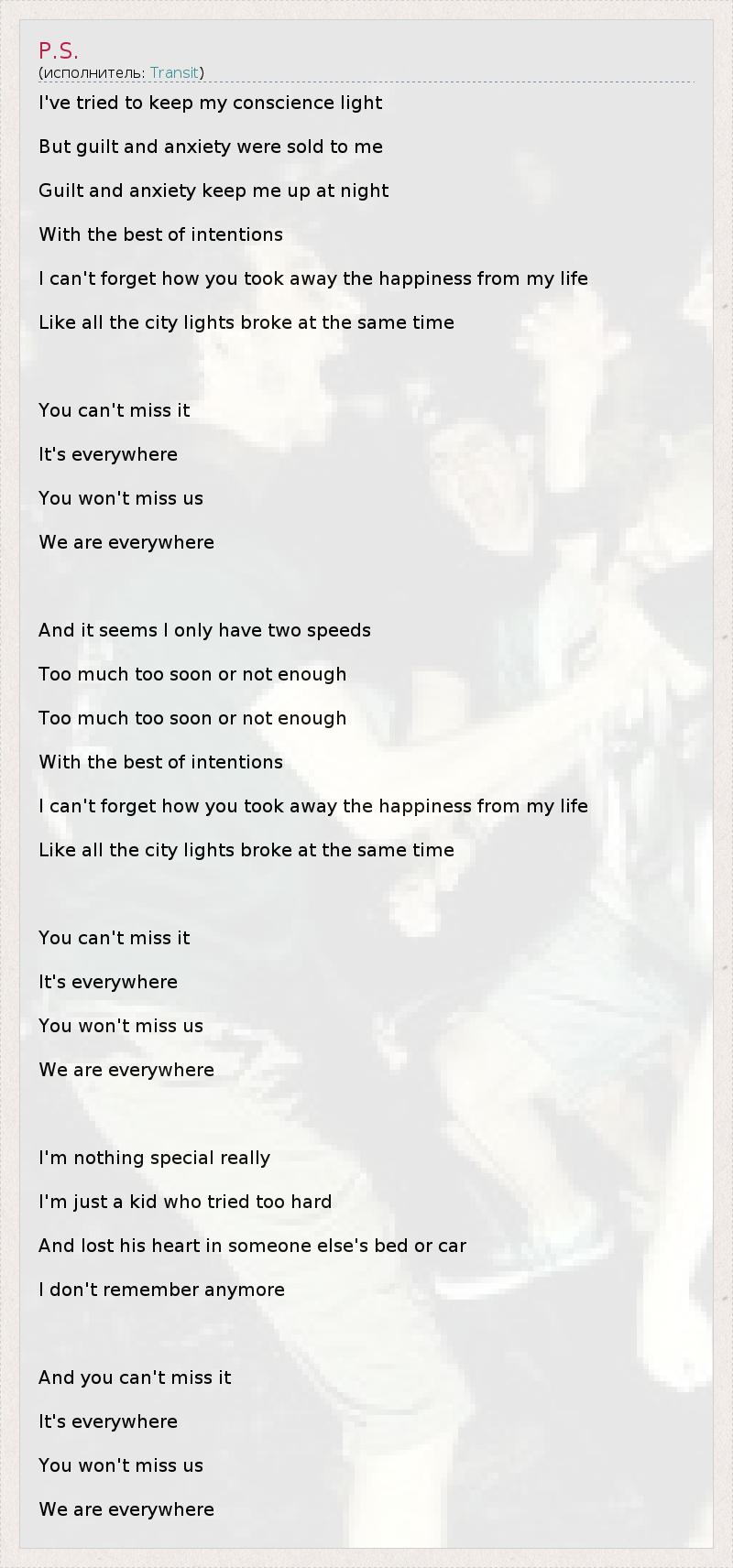 I've tried to keep my conscience light But guilt and anxiety were sold to me Guilt and anxiety keep me up at night With the best of intentions I can't forget how you took away the happiness from my life Like all the city lights broke at the same time You can't miss it It's everywhere You won't miss us We are everywhere And it seems I only have two speeds Too much too soon or not enough Too much too soon or not enough With the best of intentions I can't forget how you took away the happiness from my life Like all the city lights broke at the same time You can't miss it It's everywhere You won't miss us We are everywhere I'm nothing special really I'm just a kid who tried too hard And lost his heart in someone else's bed or car I don't remember anymore And you can't miss it It's everywhere You won't miss us We are everywhere