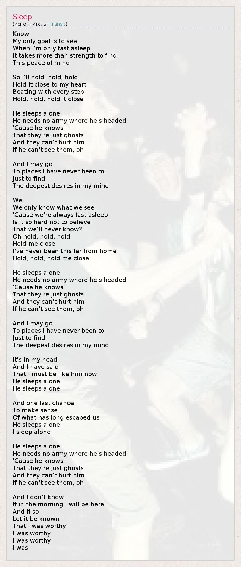 Знаешь, Моя единственная цель понять, Когда я крепко засну. Требуется много усилий, чтобы обрести Спокойствие духа. Поэтому я буду хранить, Хранить его в сердце, Бьющемся в такт шагов, Буду хранить его в сердце... Он спит один, Там, куда он направляется, ему не нужна армия, Ведь он знает, Что они только призраки И не тронут его, Пока он их не видит. И я могу пойти Туда, где никогда не был, В поисках Своих самых запретных желаний. Мы, Мы уверены только в том, что видим, Потому что находимся в состоянии перманентного сна. Разве так сложно не верить, Что мы никогда не узнаем? О, обними Обними меня покрепче. Я никогда не был так далеко от дома, Обними меня покрепче. Он спит один, Там, куда он направляется, ему не нужна армия, Ведь он знает, Что они только призраки И не тронут его, Пока он их не видит. И я могу пойти Туда, где никогда не был, В поисках Своих самых запретных желаний. Всё это только в моей голове, И я уже сказал, Что, похоже, он - это я. Он спит один, Он спит один. Это последний шанс Разобраться в том, Что давно ускользнуло от нас. Он спит один, Я сплю один. Он спит один, Там, куда он направляется, ему не нужна армия, Ведь он знает, Что они только призраки И не тронут его, Пока он их не видит. И я не знаю, Буду ли здесь завтра утром; Если да - Пусть все узнают, Что я был достоин, Я был достоин, Я был достоин, Я был...