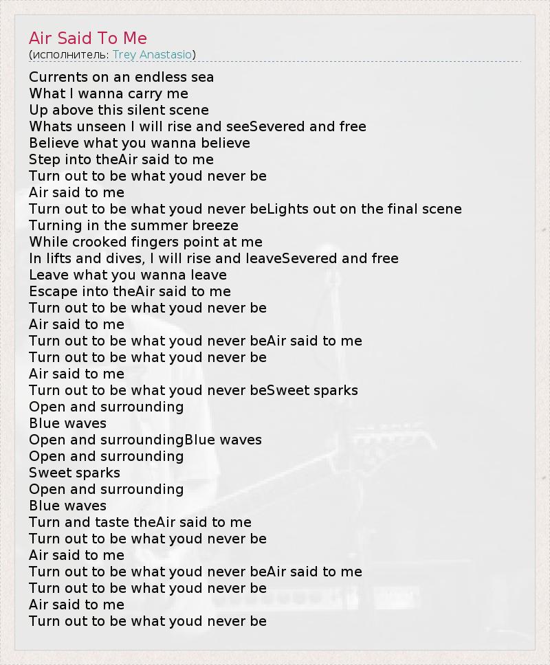 Currents on an endless sea What I wanna carry me Up above this silent scene Whats unseen I will rise and seeSevered and free Believe what you wanna believe Step into theAir said to me Turn out to be what youd never be Air said to me Turn out to be what youd never beLights out on the final scene Turning in the summer breeze While crooked fingers point at me In lifts and dives, I will rise and leaveSevered and free Leave what you wanna leave Escape into theAir said to me Turn out to be what youd never be Air said to me Turn out to be what youd never beAir said to me Turn out to be what youd never be Air said to me Turn out to be what youd never beSweet sparks Open and surrounding Blue waves Open and surroundingBlue waves Open and surrounding Sweet sparks Open and surrounding Blue waves Turn and taste theAir said to me Turn out to be what youd never be Air said to me Turn out to be what youd never beAir said to me Turn out to be what youd never be Air said to me Turn out to be what youd never be