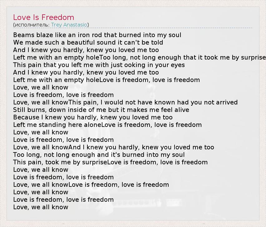 Beams blaze like an iron rod that burned into my soul We made such a beautiful sound it can't be told And I knew you hardly, knew you loved me too Left me with an empty holeToo long, not long enough that it took me by surprise This pain that you left me with just ooking in your eyes And I knew you hardly, knew you loved me too Left me with an empty holeLove is freedom, love is freedom Love, we all know Love is freedom, love is freedom Love, we all knowThis pain, I would not have known had you not arrived Still burns, down inside of me but it makes me feel alive Because I knew you hardly, knew you loved me too Left me standing here aloneLove is freedom, love is freedom Love, we all know Love is freedom, love is freedom Love, we all knowAnd I knew you hardly, knew you loved me too Too long, not long enough and it's burned into my soul This pain, took me by surpriseLove is freedom, love is freedom Love, we all know Love is freedom, love is freedom Love, we all knowLove is freedom, love is freedom Love, we all know Love is freedom, love is freedom Love, we all know