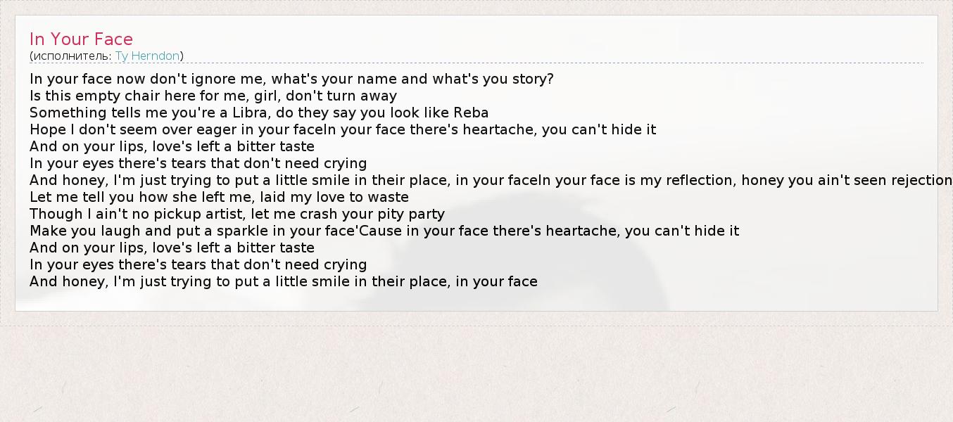 In your face now don't ignore me, what's your name and what's you story? Is this empty chair here for me, girl, don't turn away Something tells me you're a Libra, do they say you look like Reba Hope I don't seem over eager in your faceIn your face there's heartache, you can't hide it And on your lips, love's left a bitter taste In your eyes there's tears that don't need crying And honey, I'm just trying to put a little smile in their place, in your faceIn your face is my reflection, honey you ain't seen rejection Let me tell you how she left me, laid my love to waste Though I ain't no pickup artist, let me crash your pity party Make you laugh and put a sparkle in your face'Cause in your face there's heartache, you can't hide it And on your lips, love's left a bitter taste In your eyes there's tears that don't need crying And honey, I'm just trying to put a little smile in their place, in your face