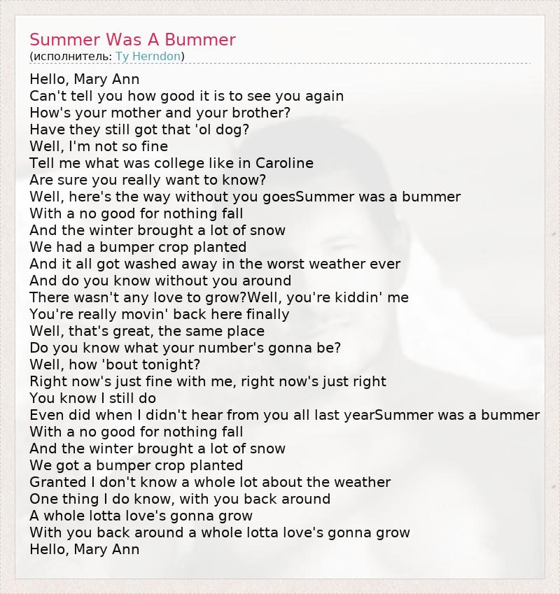 Hello, Mary Ann Can't tell you how good it is to see you again How's your mother and your brother? Have they still got that 'ol dog? Well, I'm not so fine Tell me what was college like in Caroline Are sure you really want to know? Well, here's the way without you goesSummer was a bummer With a no good for nothing fall And the winter brought a lot of snow We had a bumper crop planted And it all got washed away in the worst weather ever And do you know without you around There wasn't any love to grow?Well, you're kiddin' me You're really movin' back here finally Well, that's great, the same place Do you know what your number's gonna be? Well, how 'bout tonight? Right now's just fine with me, right now's just right You know I still do Even did when I didn't hear from you all last yearSummer was a bummer With a no good for nothing fall And the winter brought a lot of snow We got a bumper crop planted Granted I don't know a whole lot about the weather One thing I do know, with you back around A whole lotta love's gonna grow With you back around a whole lotta love's gonna grow Hello, Mary Ann
