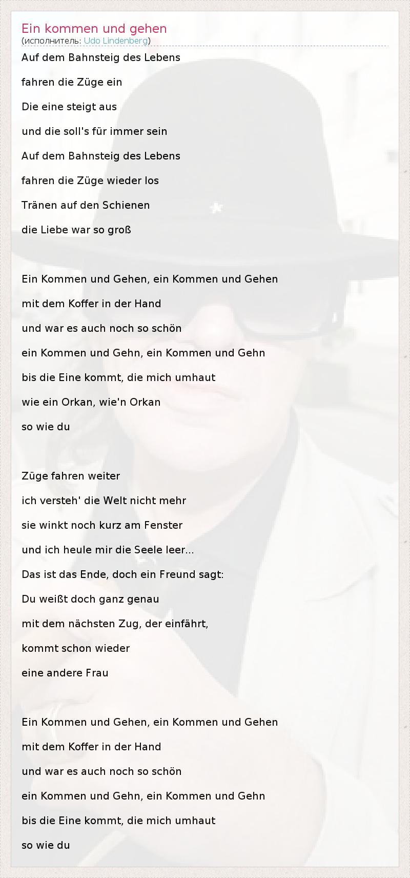Auf dem Bahnsteig des Lebens fahren die Züge ein Die eine steigt aus und die soll's für immer sein Auf dem Bahnsteig des Lebens fahren die Züge wieder los Tränen auf den Schienen die Liebe war so groß Ein Kommen und Gehen, ein Kommen und Gehen mit dem Koffer in der Hand und war es auch noch so schön ein Kommen und Gehn, ein Kommen und Gehn bis die Eine kommt, die mich umhaut wie ein Orkan, wie'n Orkan so wie du Züge fahren weiter ich versteh' die Welt nicht mehr sie winkt noch kurz am Fenster und ich heule mir die Seele leer... Das ist das Ende, doch ein Freund sagt: Du weißt doch ganz genau mit dem nächsten Zug, der einfährt, kommt schon wieder eine andere Frau Ein Kommen und Gehen, ein Kommen und Gehen mit dem Koffer in der Hand und war es auch noch so schön ein Kommen und Gehn, ein Kommen und Gehn bis die Eine kommt, die mich umhaut so wie du