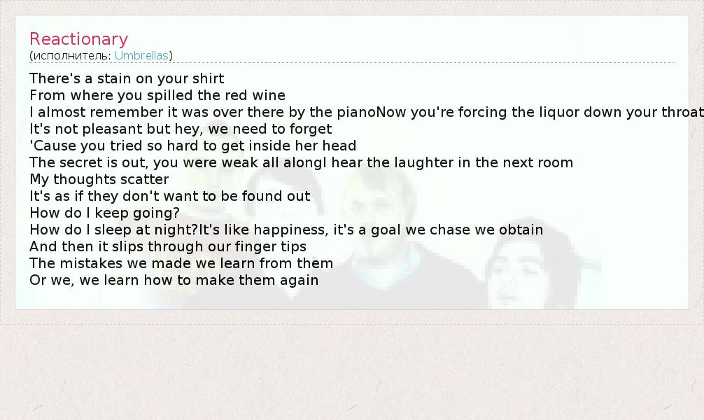 Это интересно:http://www.myspace.com/umbrellasAfter issuing two albums and an EP of largely acoustic work under the moniker the Lyndsay Diaries, Scott Windsor further embraced his indie pop side with a new project, Umbrellas. Collaborating with various studio musicians – including Chad Copelin, Nathan Price, and Eric Arndt – Umbrellas debuted in spring 2005 with a self-titled collection of refreshing and dynamic pop music. Produced by Ed Rose, the album was issued through The Militia Group, the same label Windsor worked with for the Lyndsay Diaries. Heavy touring followed in support (with different backing members than on the... продолжение