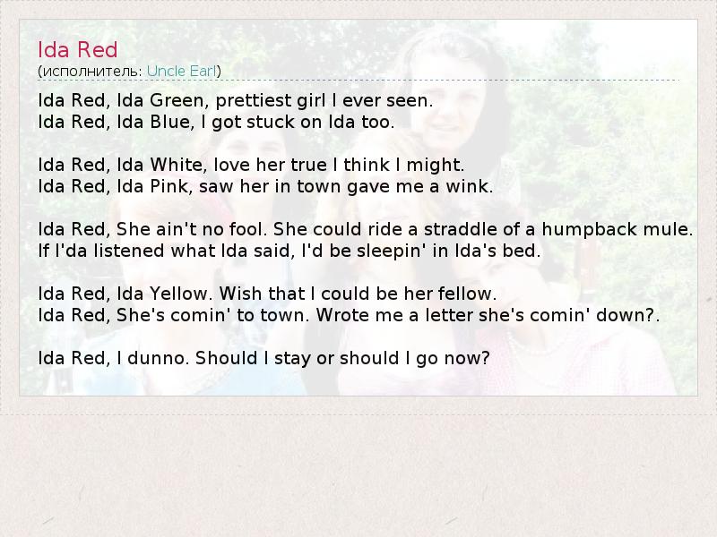 Ida Red, Ida Green, prettiest girl I ever seen. Ida Red, Ida Blue, I got stuck on Ida too. Ida Red, Ida White, love her true I think I might. Ida Red, Ida Pink, saw her in town gave me a wink. Ida Red, She ain't no fool. She could ride a straddle of a humpback mule. If I'da listened what Ida said, I'd be sleepin' in Ida's bed. Ida Red, Ida Yellow. Wish that I could be her fellow. Ida Red, She's comin' to town. Wrote me a letter she's comin' down?. Ida Red, I dunno. Should I stay or should I go now?