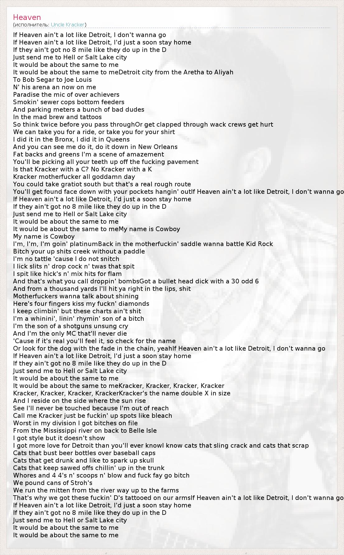 Это интересно:Uncle Kracker (настоящее имя Matthew Shafer) - американский рок-певец. Родился 9 ноября 1974 года в Мичигане. В 1987 году встретил Кид Рока, который попросил его стать ди-джеем. В середине 1990 годов Kracker занимался ди-джействованием в Детройте, в клубе The Pretty Woman. В 1999 году вышел дебютный альбом "Double Wide". Uncle Kracker участвовал в записи альбома Кид Рока "Cocky" в 2001 году. 16 ноября 2006 года началась работа над... продолжение