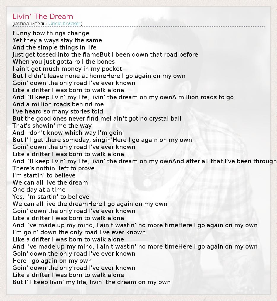 And I'll keep livin' my life, livin' the dream on my ownAnd after all that I've been through