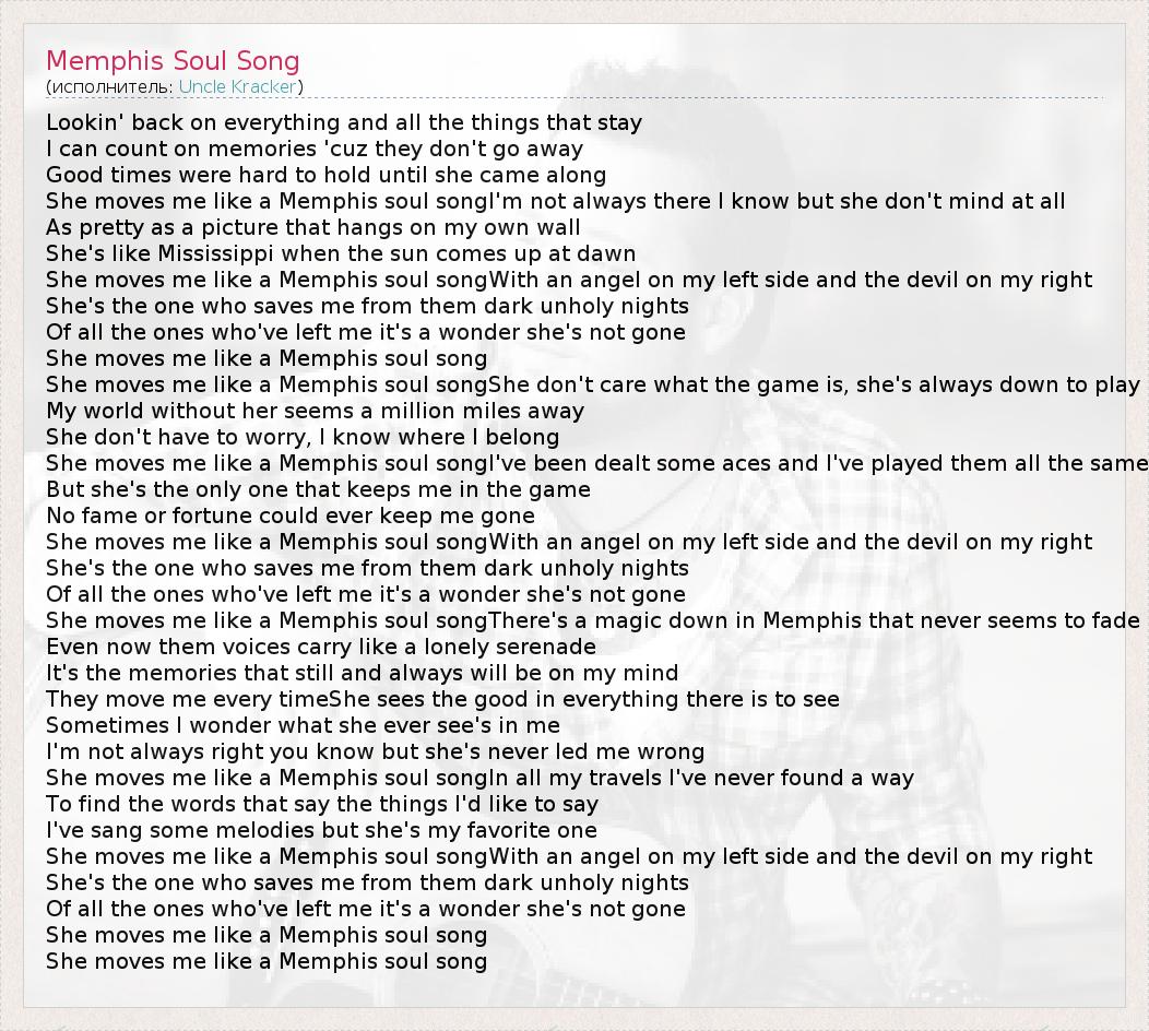 Lookin' back on everything and all the things that stay I can count on memories 'cuz they don't go away Good times were hard to hold until she came along She moves me like a Memphis soul songI'm not always there I know but she don't mind at all As pretty as a picture that hangs on my own wall She's like Mississippi when the sun comes up at dawn She moves me like a Memphis soul songWith an angel on my left side and the devil on my right She's the one who saves me from them dark unholy nights Of all the ones who've left me it's a wonder she's not gone She moves me like a Memphis soul song She moves me like a Memphis soul songShe don't care what the game is, she's always down to play My world without her seems a million miles away She don't have to worry, I know where I belong She moves me like a Memphis soul songI've been dealt some aces and I've played them all the same But she's the only one that keeps me in the game No fame or fortune could ever keep me gone She moves me like a Memphis soul songWith an angel on my left side and the devil on my right She's the one who saves me from them dark unholy nights Of all the ones who've left me it's a wonder she's not gone She moves me like a Memphis soul songThere's a magic down in Memphis that never seems to fade Even now them voices carry like a lonely serenade It's the memories that still and always will be on my mind They move me every timeShe sees the good in everything there is to see Sometimes I wonder what she ever see's in me I'm not always right you know but she's never led me wrong She moves me like a Memphis soul songIn all my travels I've never found a way To find the words that say the things I'd like to say I've sang some melodies but she's my favorite one She moves me like a Memphis soul songWith an angel on my left side and the devil on my right She's the one who saves me from them dark unholy nights Of all the ones who've left me it's a wonder she's not gone She moves me like a Memphis soul song She moves me like a Memphis soul song