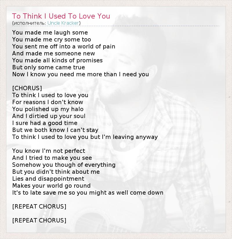 You made me laugh some You made me cry some too You sent me off into a world of pain And made me someone new You made all kinds of promises But only some came true Now I know you need me more than I need you [CHORUS] To think I used to love you For reasons I don't know You polished up my halo And I dirtied up your soul I sure had a good time But we both know I can't stay To think I used to love you but I'm leaving anyway You know I'm not perfect And I tried to make you see Somehow you though of everything But you didn't think about me Lies and disappointment Makes your world go round It's to late save me so you might as well come down [REPEAT CHORUS] [REPEAT CHORUS]