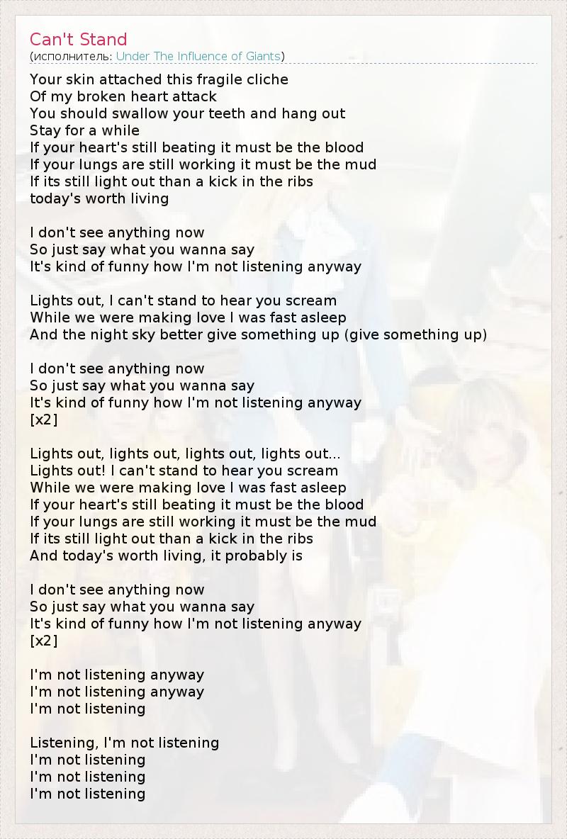 В твою кожу уже въелся этот хрупкий шаблон Приступов моего разбитого сердца. Проглоти свои зубы и живи, Останься ненадолго. Если твоё сердце по-прежнему бьётся, должно быть, это кровь. Если твои лёгкие ещё работают, должно быть, это грязь. Если всё работает, тогда удар по рёбрам – и день прожит не зря. Я ничего сейчас не вижу, Поэтому говори, что ты хотела сказать. Забавно, но я всё равно не слушаю. Свет выключен, я не могу слушать твои крики. Когда мы занимались любовью, я быстро засыпал, И лучше бы ночное небо подсказало что-нибудь новое (подсказало что-нибудь новое). Я ничего сейчас не вижу, Поэтому говори, что ты хотела сказать. Забавно, но я всё равно не слушаю. (х2) Свет выключен, свет выключен, свет выключен, Смерть! Я не могу терпеть твои крики. Когда мы занимались любовью, я быстро засыпал. Если твоё сердце по-прежнему бьётся, должно быть, это кровь. Если твои лёгкие ещё работают, должно быть, это грязь. Если всё работает, тогда удар по рёбрам – И день прожит не зря, наверное, так... Я ничего сейчас не вижу, Поэтому говори, что ты хотела сказать. Забавно, но я всё равно не слушаю. [x2] Я всё равно не слушаю, Я всё равно не слушаю, Я не слушаю! Слушаю, я не слушаю, Я не слушаю, Я не слушаю, Я не слушаю!